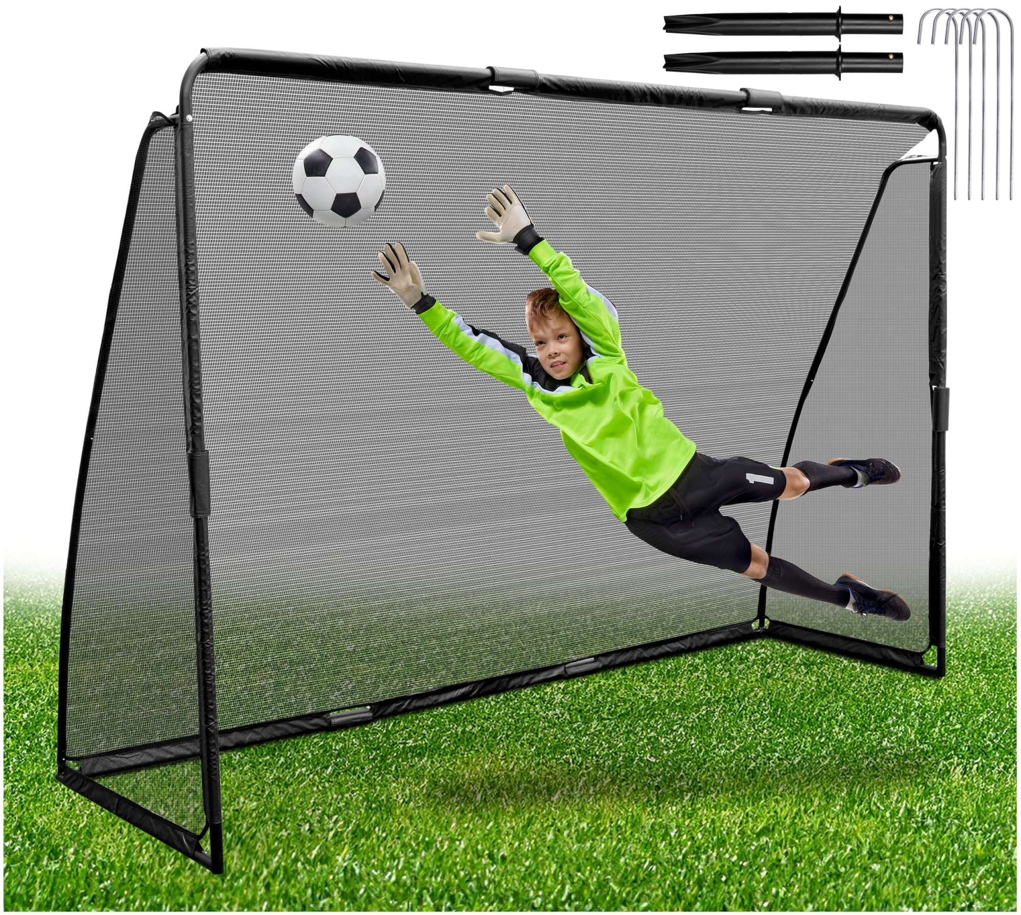 Całą konstrukcję wykonano z solidnych metalowych profili, a montaż jest szybki i bezproblemowy. Nie potrzebujesz do tego żadnych specjalnych narzędzi. Aby zwiększyć stabilność bramki, wystarczy ją przytwierdzić do podłoża za pomocą dołączonych do zestawu szpilek i kotw.