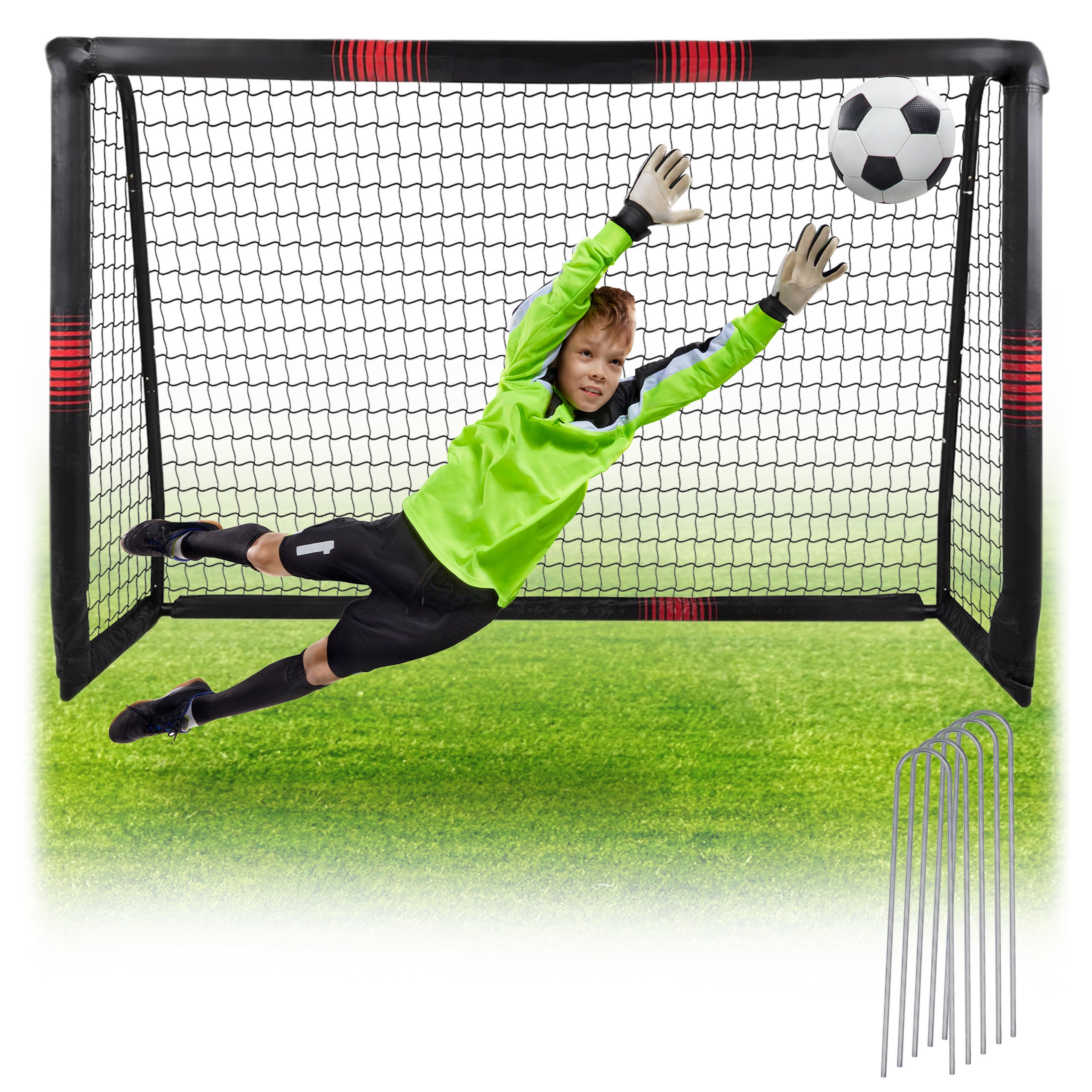 5 śledzi do mocowania bramki do podłoża zapewnia stabilność podczas gry, nawet przy silnych strzałach.