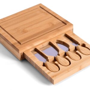 Deska do serów Warna to elegancka deska serowara z wysuwaną szufladą i akcesoriami. Wykonana z 100% drewna bambusowego o wysokiej jakości. Idealna do serwowania i krojenia serów, wędlin i przekąsek. Ma wysuwaną szufladę z akcesoriami ze stali nierdzewnej. Zapewnia stabilność dzięki antypoślizgowym nóżkom. Praktyczne i kompaktowe wymiary 22x19x4,5 cm. Doskonały pomysł na prezent dla miłośników serów. Unikalny design i wysoka jakość wykonania. Niezastąpione akcesorium dla smakoszy.