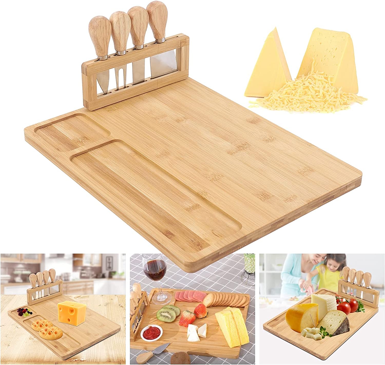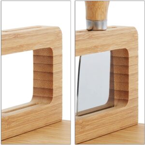 Deskę Salers wykonano ze 100% drewna bambusowego wysokiej jakości. Doskonały pomysł na prezent dla miłośników serów i nie tylko. Deska wyposażona w specjalny stojak, na którym znajduje się komplet noży ze stali nierdzewnej. Wgłębienia na brzegach pozwalają na efektowne ułożenie przekąsek i dodatków. Dodatkowe akcesoria ułatwią nakładanie i krojenie przekąsek oraz utrzymanie porządku na stole. Deska świetnie sprawdzi się podczas każdej imprezy czy spotkań ze znajomymi.