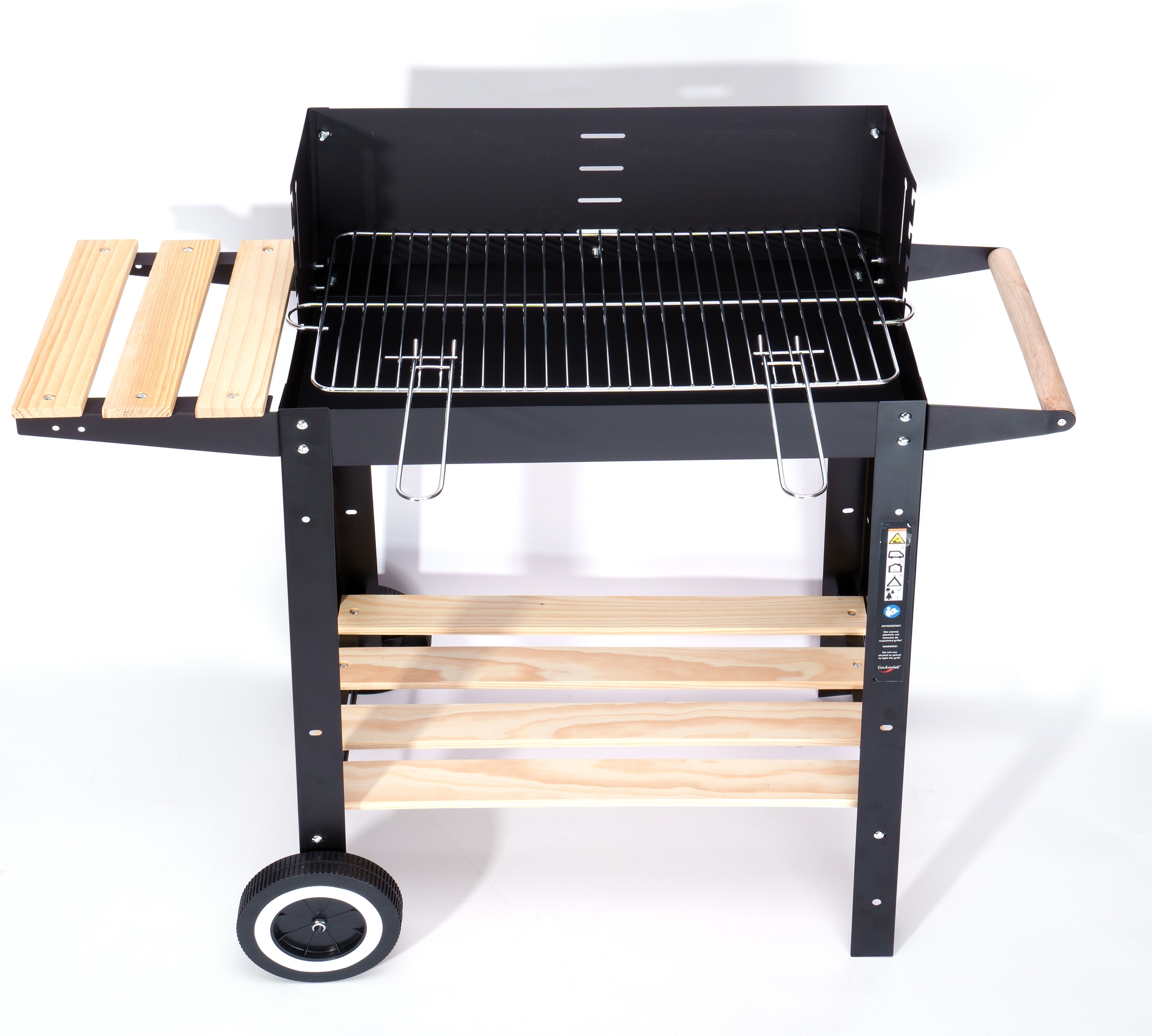 Grill został zaprojektowany z myślą o maksymalnej funkcjonalności, dlatego wyposażono go w dolną drewnianą półkę, która idealnie sprawdza się do przechowywania akcesoriów grillowych. Ta przemyślana funkcja pozwala na łatwy dostęp do wszystkich niezbędnych narzędzi i dodatków, upraszczając organizację miejsca grillowania.