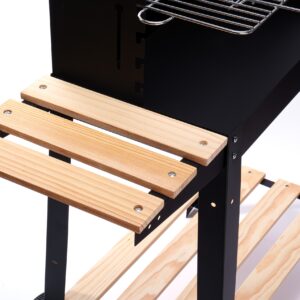 ✅Praktyczne półki: Grill wyposażony jest w małą boczną drewnianą półkę pomocniczą, idealną do trzymania przypraw, narzędzi grillowych, czy potraw gotowych do grilowania. Dolna półka natomiast świetnie nada się jako półka na brykiet, węgiel czy inne akcesoria, co znacznie ułatwia organizację przestrzeni grillowej.