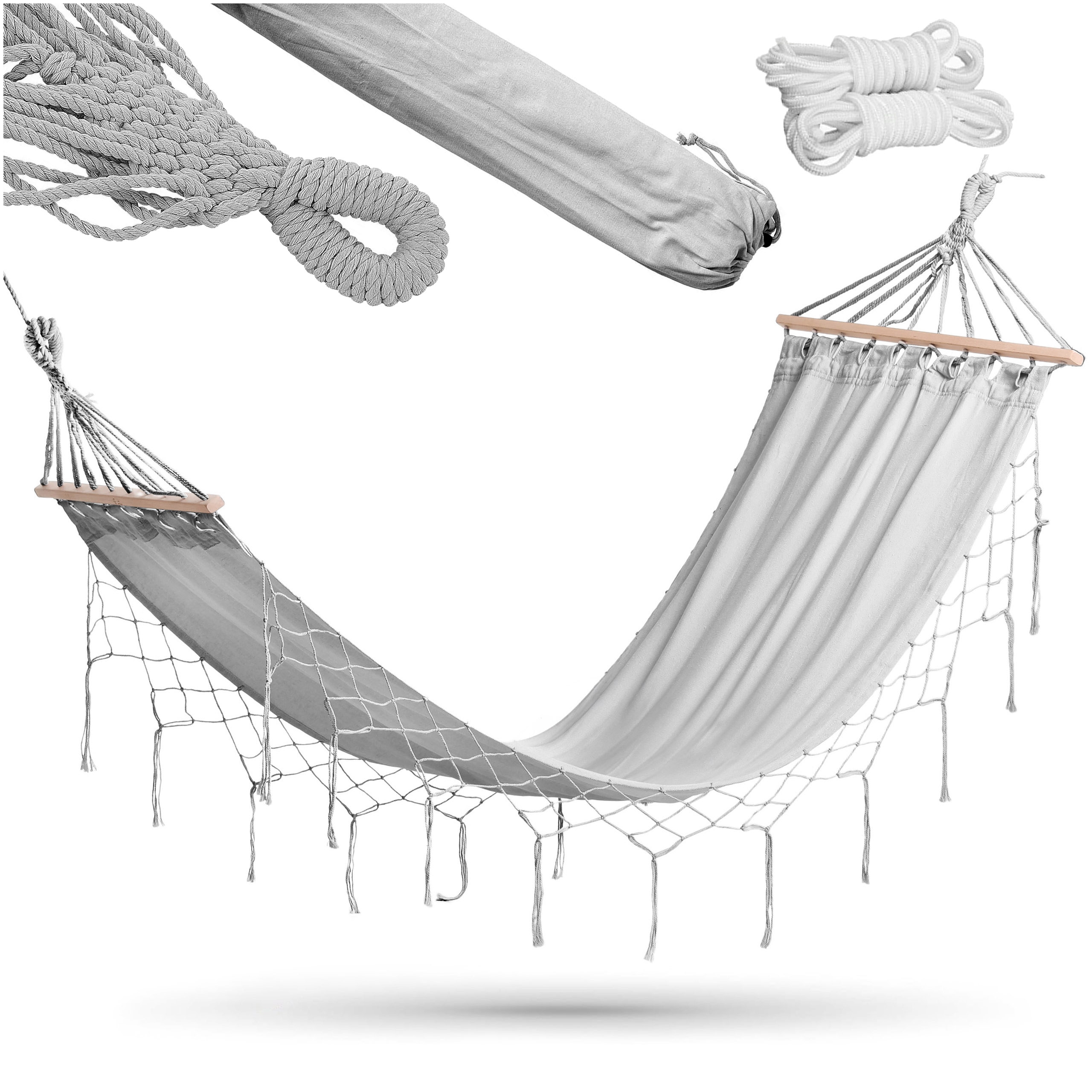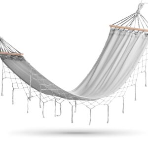 ✅ Drewniane drążki stabilizujące: Nie tylko zwiększają estetykę hamaka, ale także rozkładają ciężar równomiernie, co zwiększa komfort leżenia.