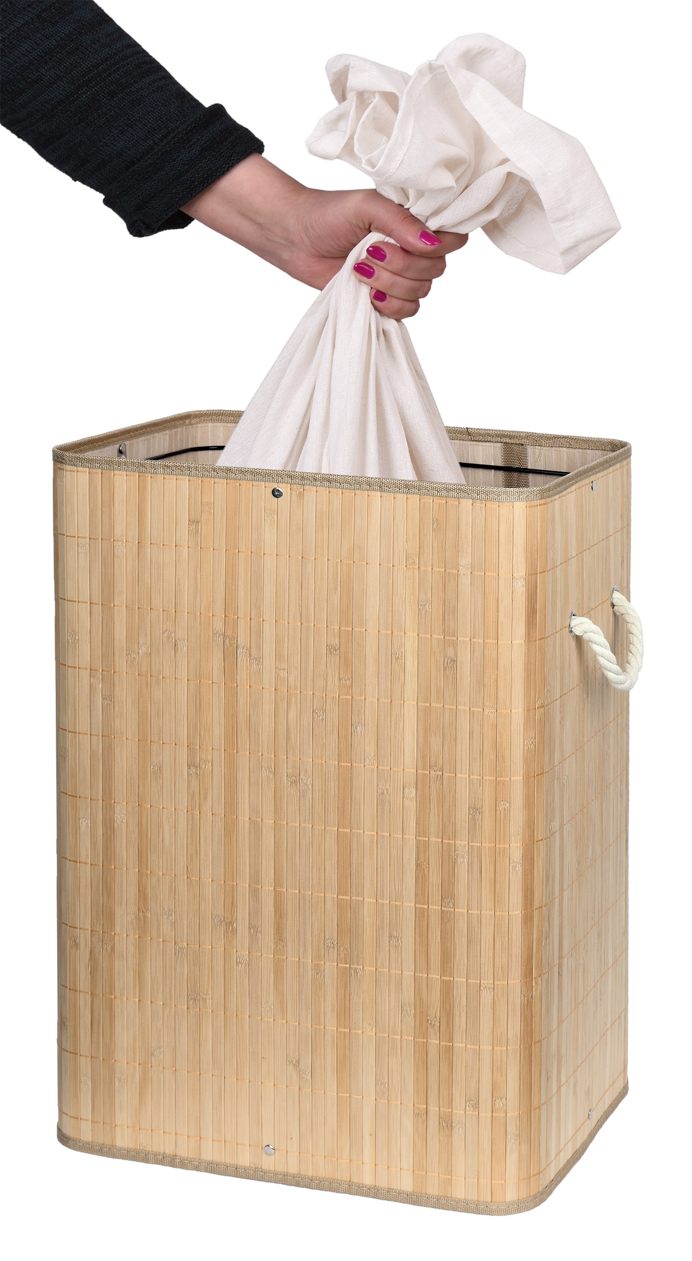 Najtrwalsze pojemniki na odpady o pojemności 80 litrów. Wykonane z naturalnego bambusa. Wnętrze wypełnia materiałowa torba. Prosta budowa, sztywna konstrukcja. Ukrywa nieprzyjemne zapachy. Umożliwia wygodne szybkie i pranie.
