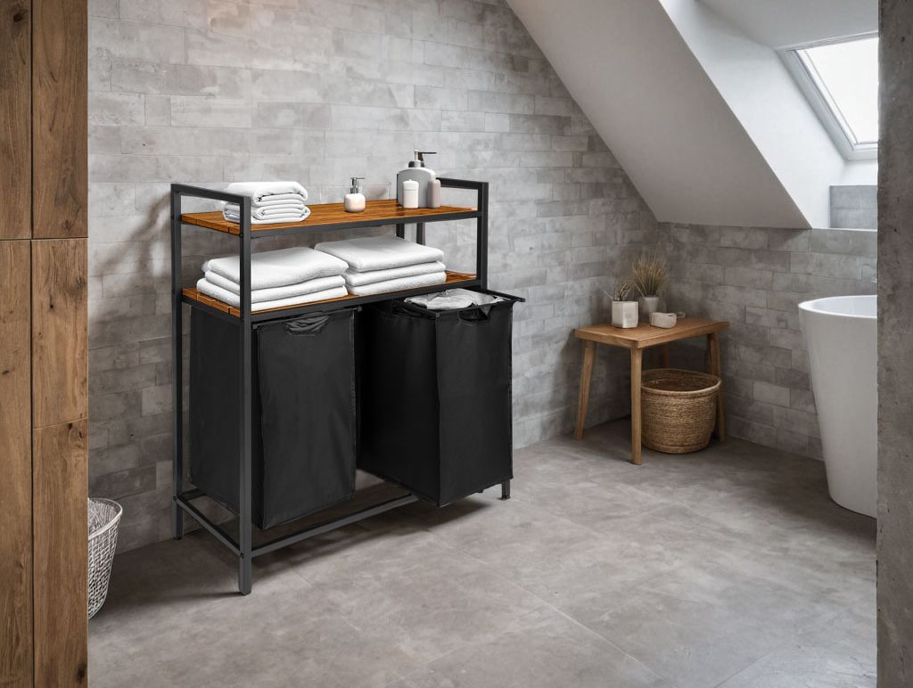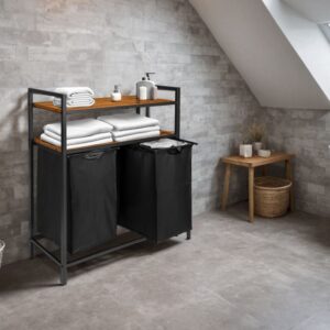 Kosz na pranie Mirun z dwiema komorami i dodatkowymi półkami to idealna opcja dla tych, którzy cenią sobie połączenie funkcjonalności z estetyką. Dzięki dwóm komorom łatwiej jest sortować pranie, a półki zapewniają dodatkową przestrzeń na ręczniki czy akcesoria łazienkowe. Solidna budowa i loftowy design kosza doskonale współgrają z różnorodnymi stylami wnętrz, dodając im industrialnego uroku. Zakup bezpośrednio od producenta gwarantuje najwyższą jakość w rozsądnej cenie. Kosz Mirun jest praktycznym rozwiązaniem do utrzymania porządku w łazience i optymalizacji przestrzeni.