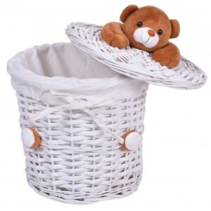 Produkt wykonany z wikliny równym splotem, w środku wyścielony wytrzymałym, kremowym, lnianym materiałem. Pokrywa posiada na górze przyjemnego w dotyku, pluszowego misia.