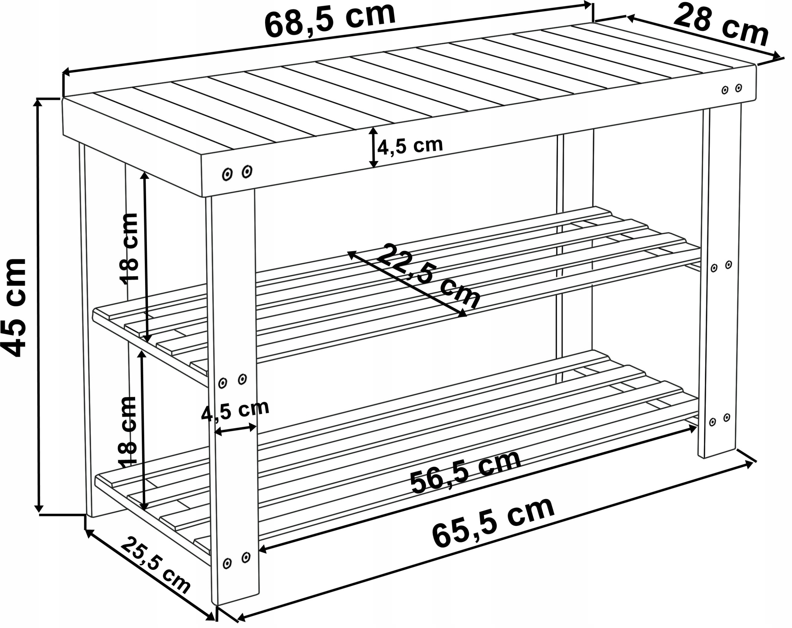 Dwa poziomy z odpowiednim odstępem zapewniają miejsce na maksymalnie 6 par butów, regał na buty może być używany również jako ławka, można też na nim stawiać rośliny, torby lub akcesoria łazienkowe.