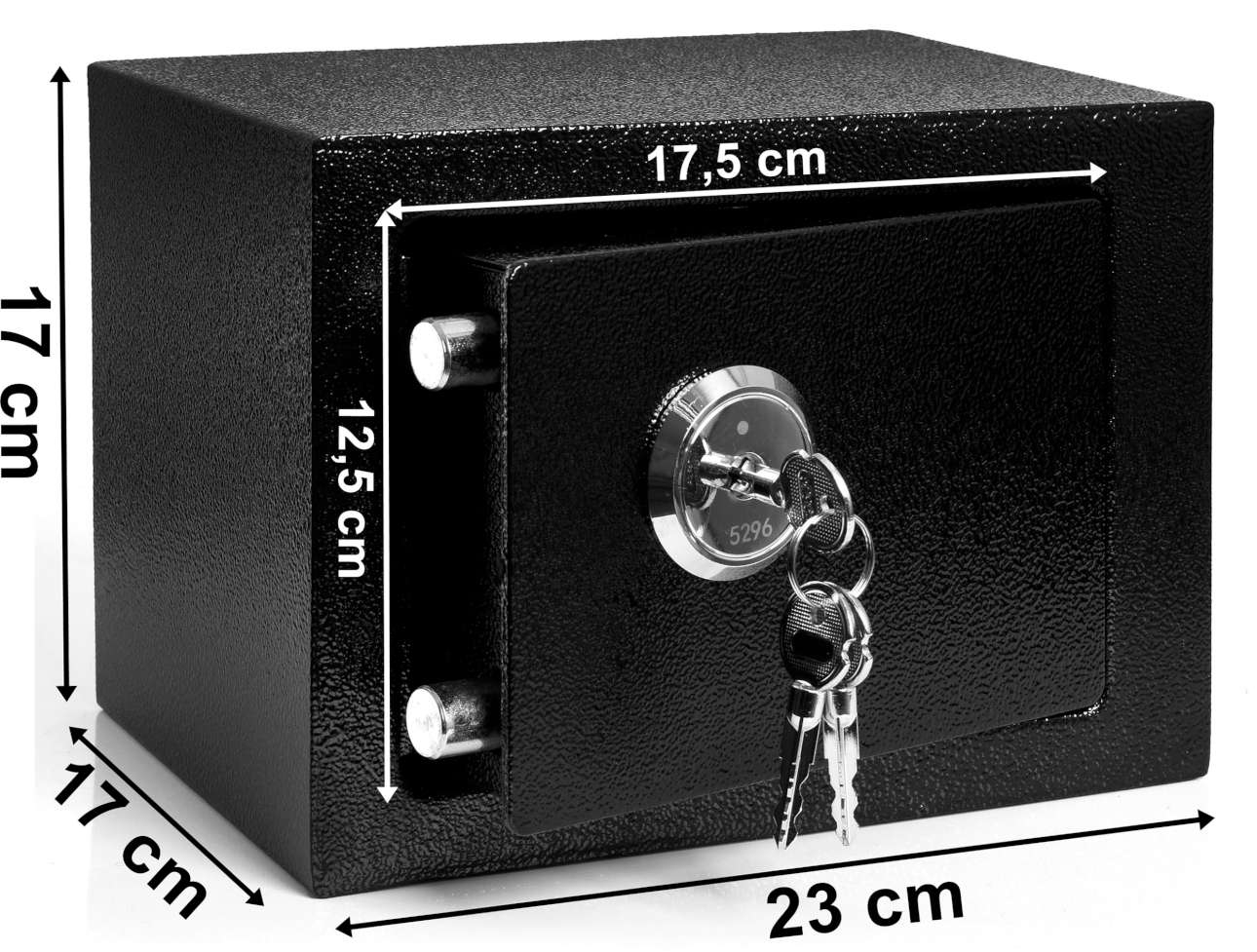 SICURO czarny sejf zamykany na klucz to produkt o wymiarach (17x23x17 cm) i wewnętrznych wymiarach (16,5×22,5×16,5 cm). Drzwiczki sejfu mają wymiary (12,5×17,5 cm) i zamknięcie na klucz. W zestawie znajdują się 3 klucze i kołki mocujące, umożliwiające łatwy montaż sejfu na ścianie lub podłodze. Sejf waży 2,9 kg i jest wykonany z metalu. Produkt oferuje bezpieczeństwo, poufność, trwałość, łatwy montaż oraz elastyczność w zakresie przechowywania różnych przedmiotów.