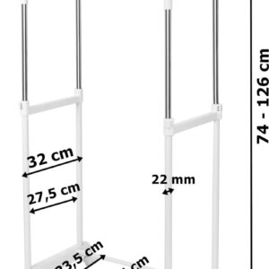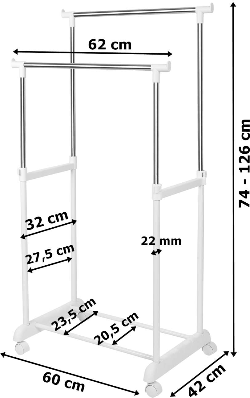 RIKE, wieszak stojący marki Gockowiak, to doskonałe rozwiązanie do organizacji garderoby. Wykonany z najwyższej jakości materiałów, dbając o najmniejsze detale. Model posiada solidne stalowe rurki i wytrzymałe elementy z tworzywa sztucznego. Z podwójnymi drążkami pomieści wiele ubrań, od płaszczy po koszule. Regulowana wysokość (74-126 cm) i dolna półka na buty lub akcesoria. Mobilny dzięki solidnym kółkom. Elegancki biały kolor pasuje do różnych wnętrz. Idealny dla stylów: skandynawskiego, nowoczesnego i klasycznego.