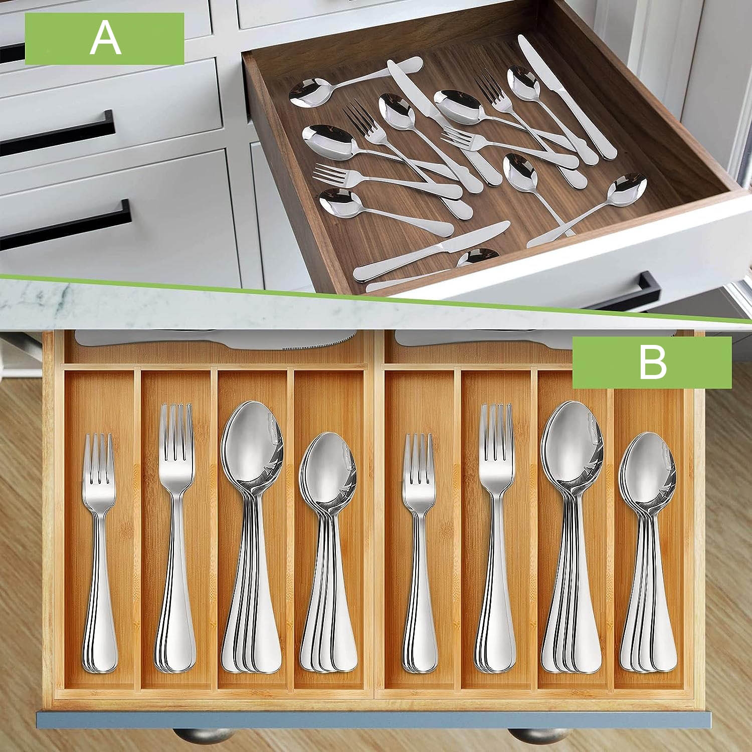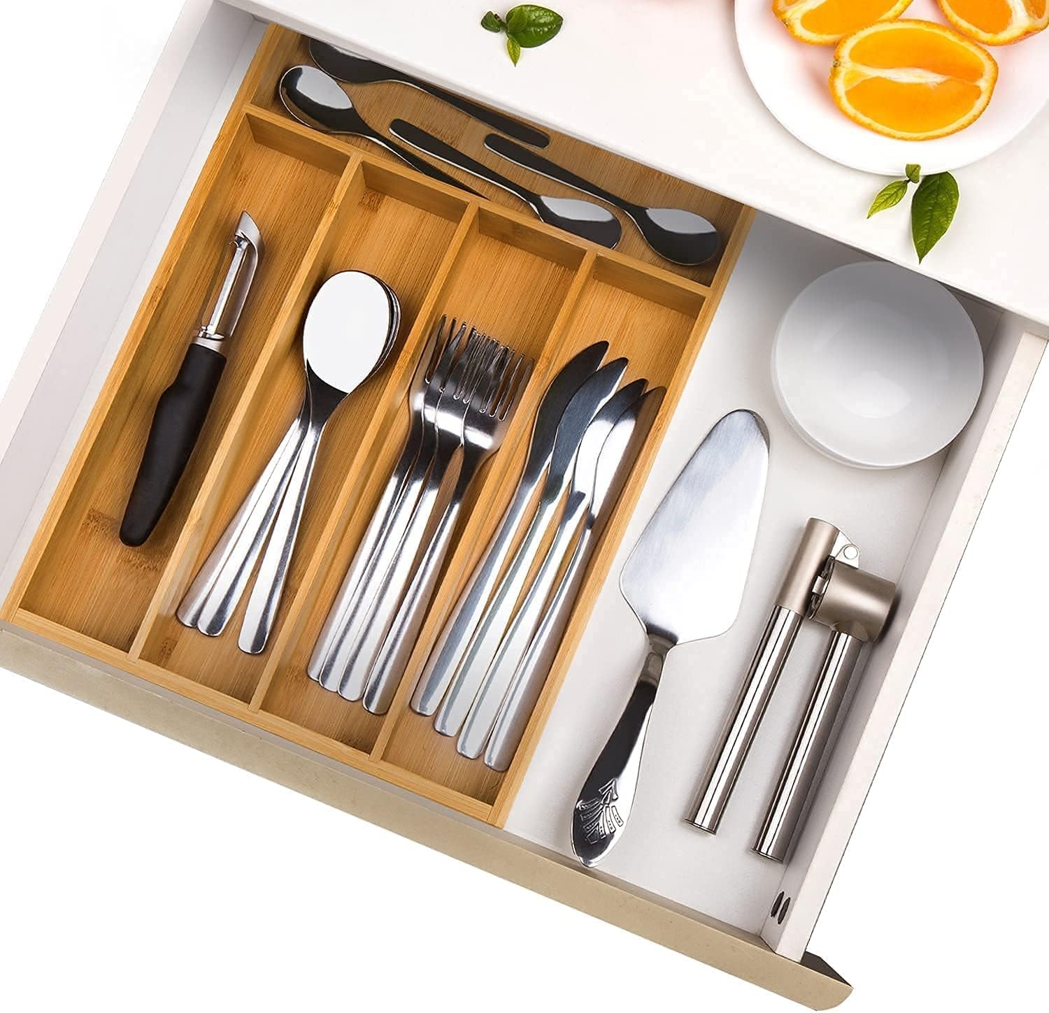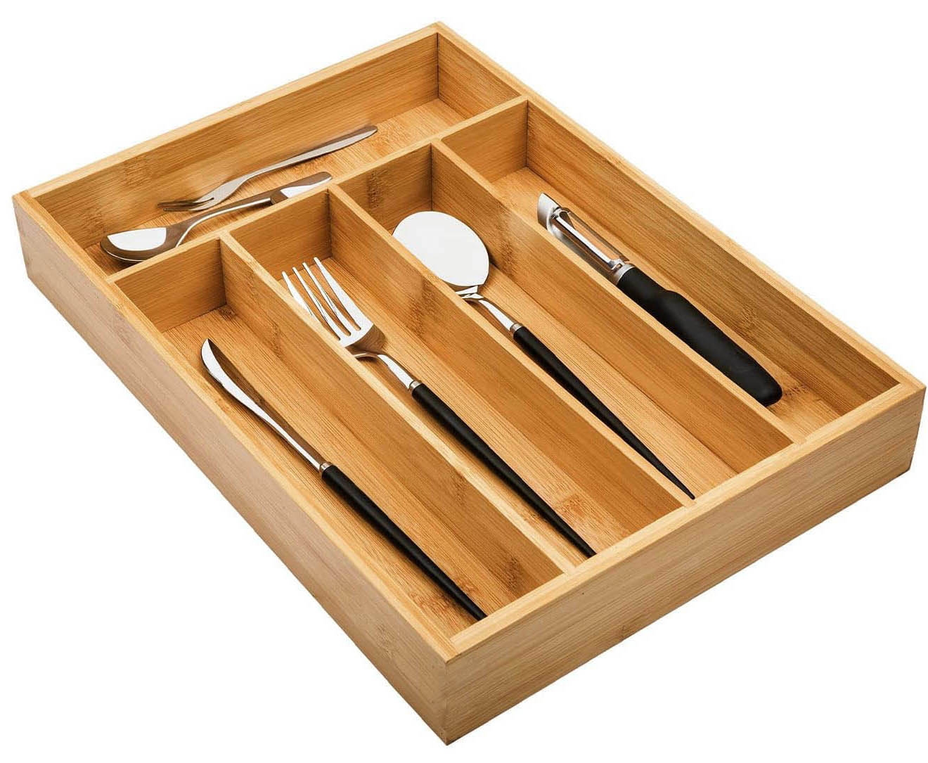 Wymiary: 25 x 35 cm sprawiają, że pasuje do większości szuflad, oferując 5 przegródek na sztućce i inne przedmioty. To nie tylko miejsce na sztućce, ale także wszechstronny organizer do przechowywania akcesoriów czy kosmetyków w kuchni, biurze czy łazience.