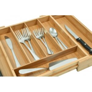 Organizer bambusowy jest rozkładany, boczne przegrody można w razie potrzeby wsunąć do środka i zaoszczędzić cenną przestrzeń. Dzięki niemu w szufladach kuchennych zapanuje ład i porządek. Jego kompaktowe wymiary sprawiają, że będzie pasował do większości standardowych szuflad.