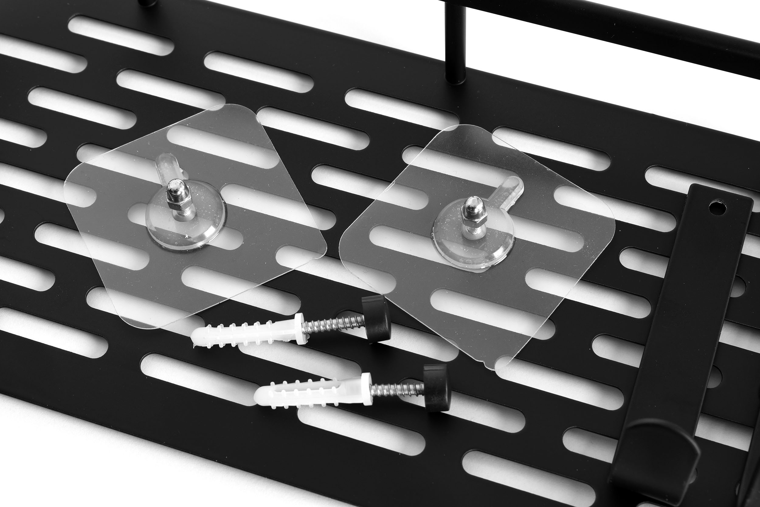 W zestawie: półka, dwa haczyki, dwie naklejki z klejem, dwa kołki montażowe, zaślepki, instrukcja