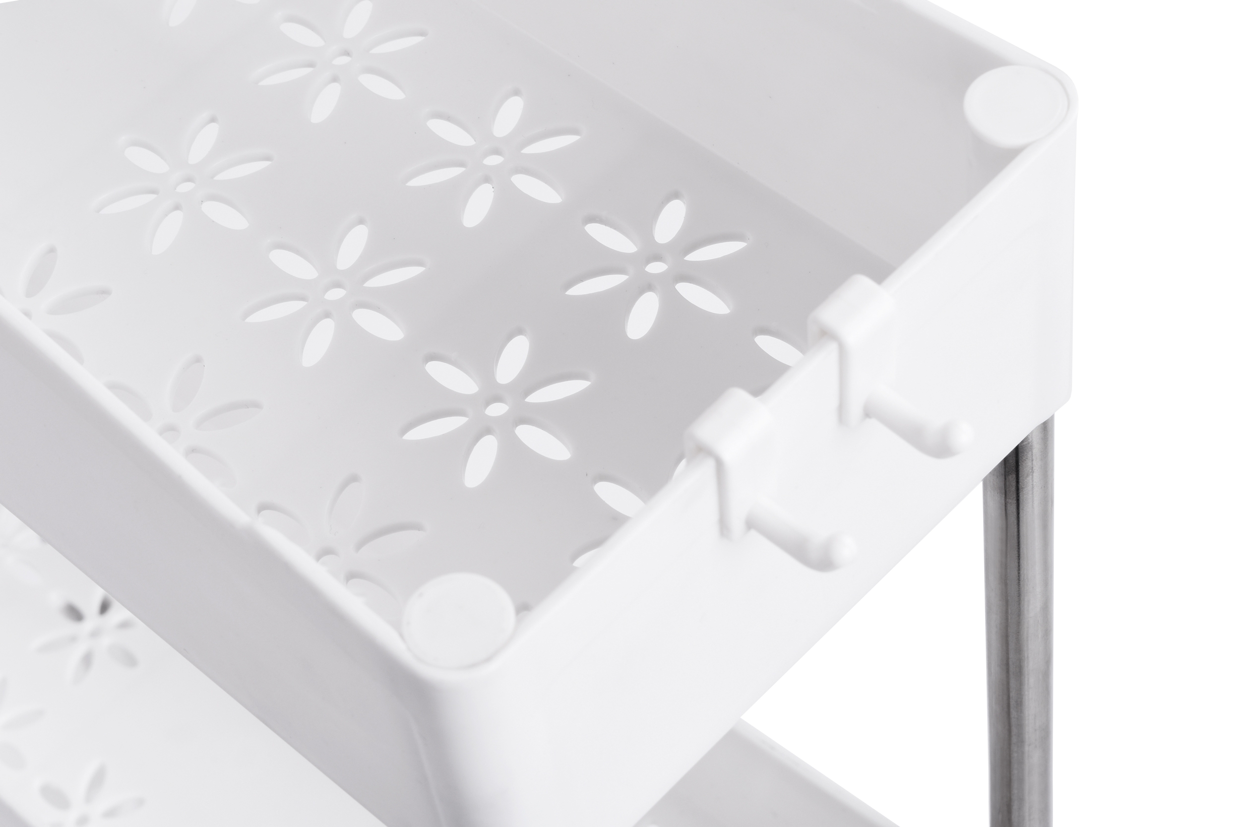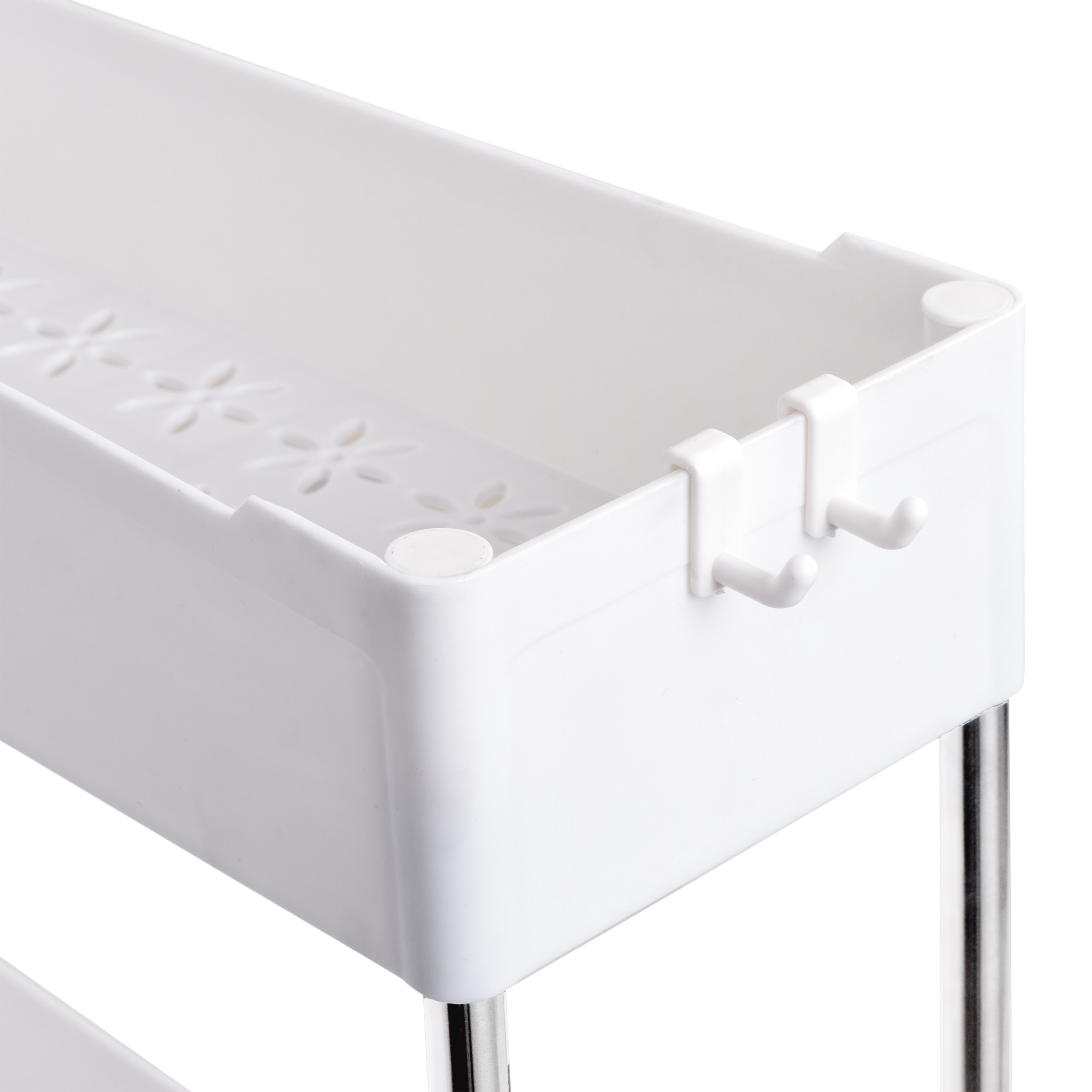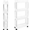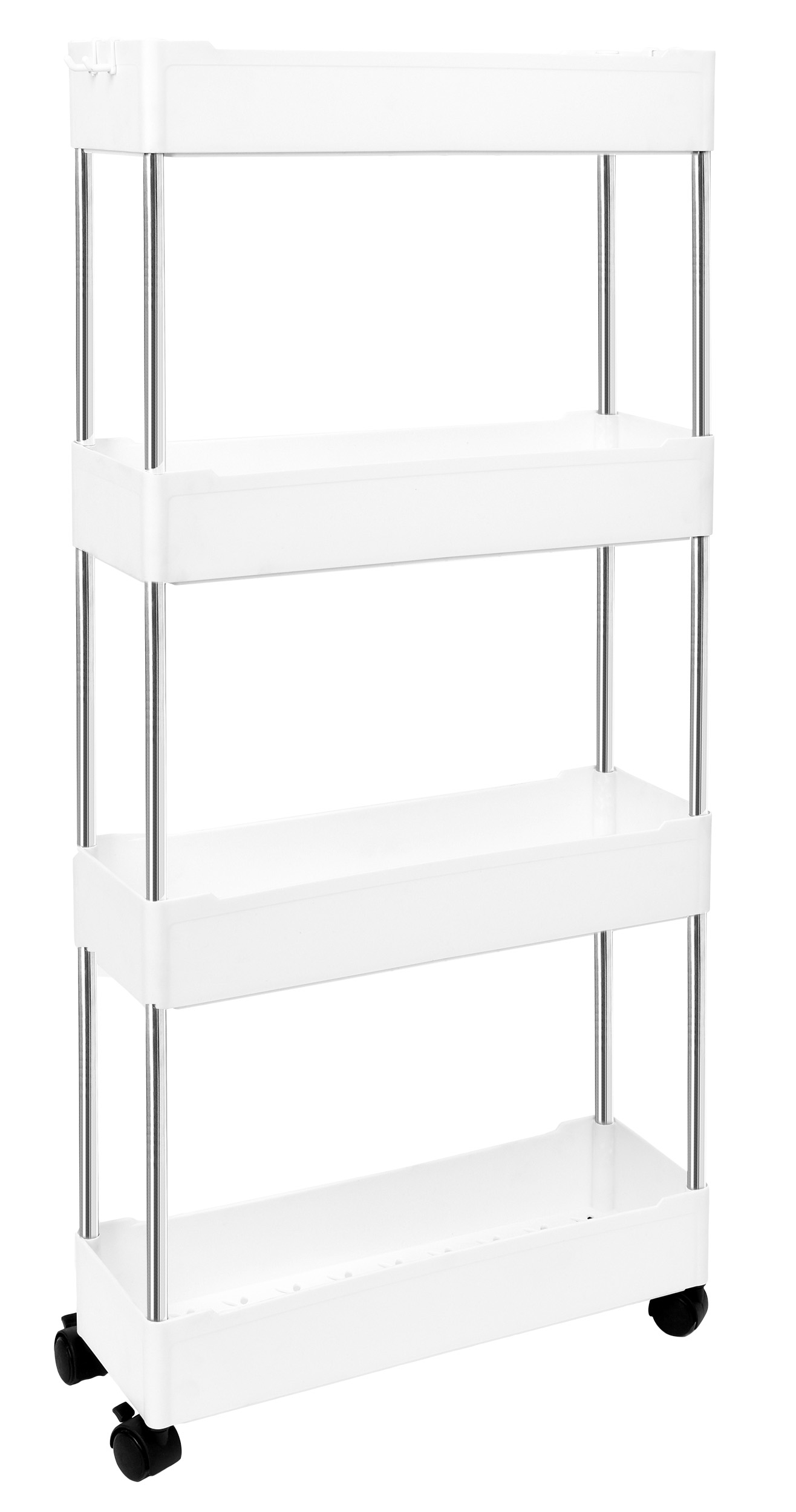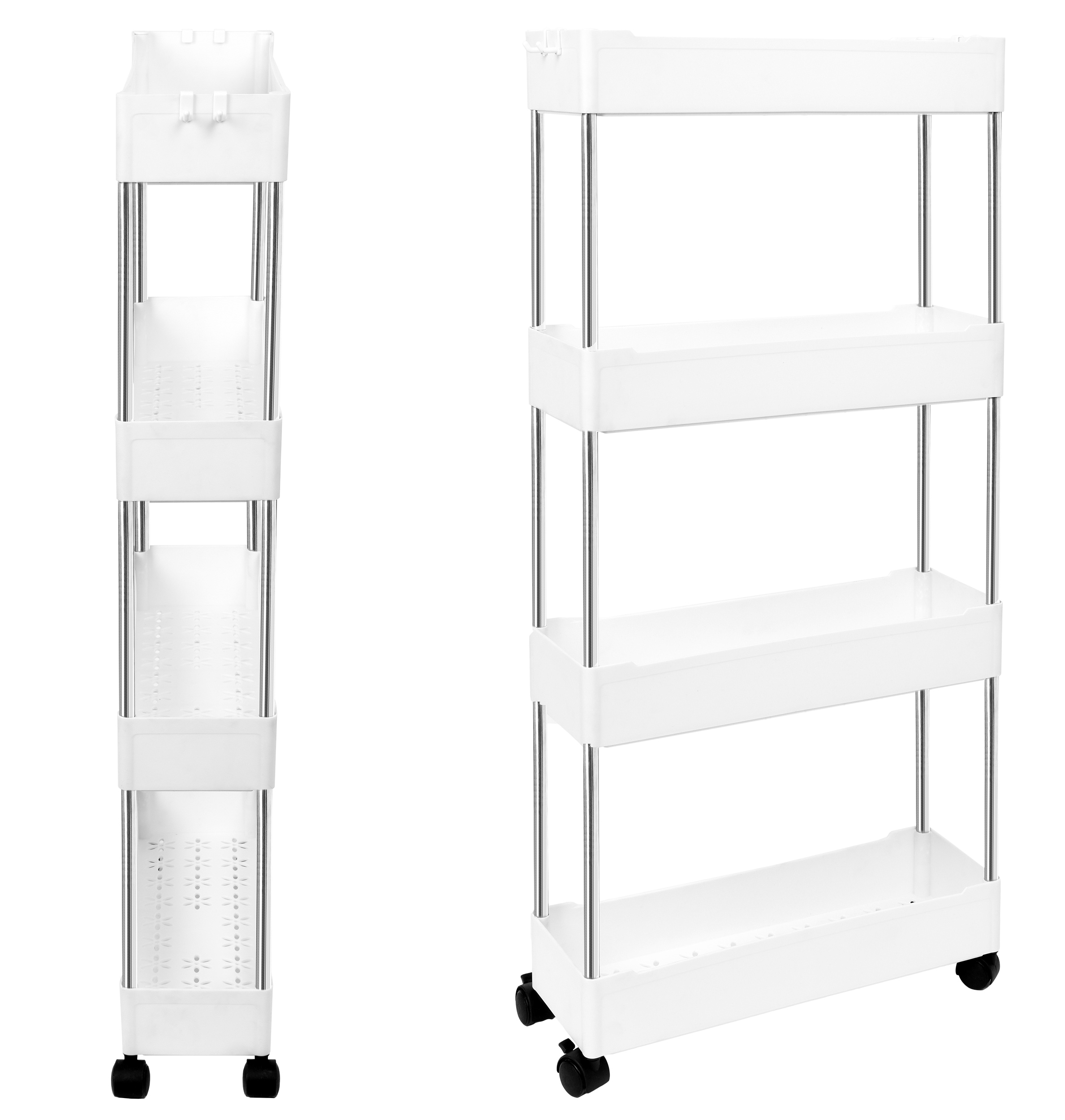 Półki zostały zaprojektowane tak, by wykorzystać wąskie przestrzenie np. między lodówką a szafką lub pralką a szafką. Posiadają 4 głębokie poziomy, które pozwolą pomieścić wiele rzeczy np. akcesoria kuchenne, butelki, przyprawy. Doskonale sprawdzą się również jako regał łazienkowy na kosmetyki, papier, płyny lub proszki. Zastosowanie 4 kółek pozwoli w łatwy i szybki sposób przesuwać konstrukcję.