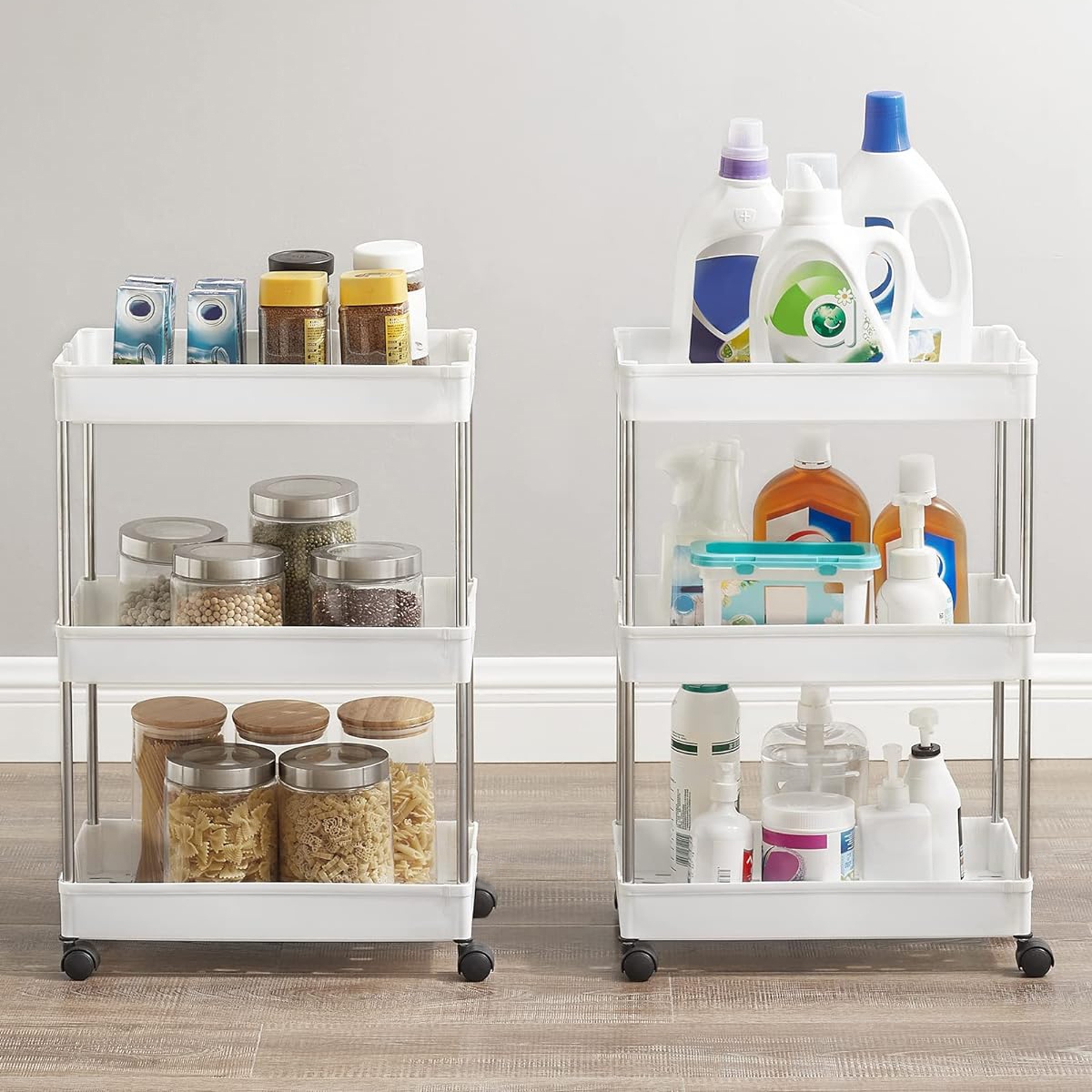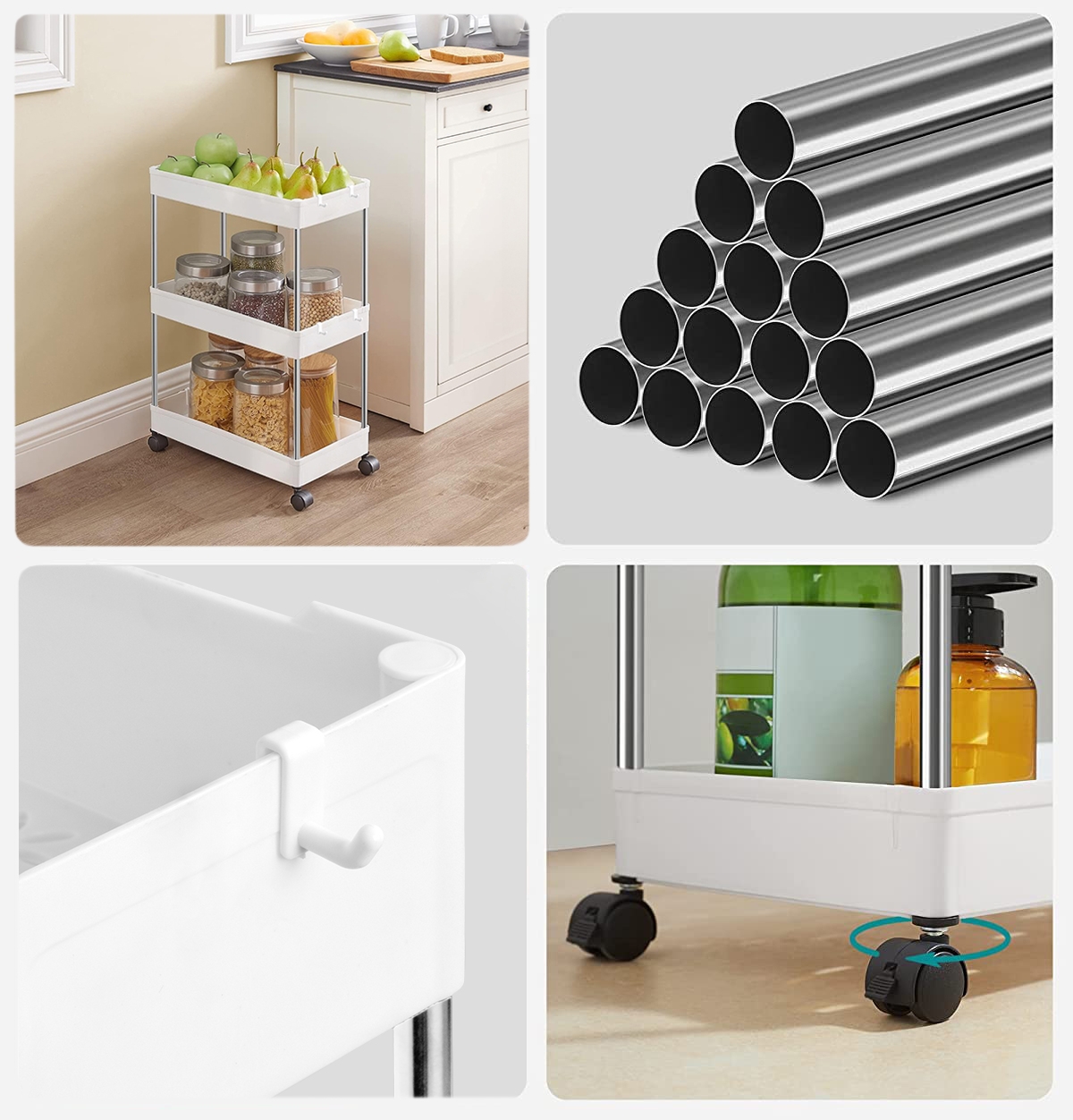Regał „Talmer” został wykonany z trwałych, wysokiej jakości materiałów, w tym z tworzywa sztucznego i metalu, co zapewnia jego długotrwałe użytkowanie i łatwość w utrzymaniu czystości. Jego uniwersalny design doskonale komponuje się z różnymi stylami wnętrzarskimi, a lekka konstrukcja (tylko 1,5 kg) umożliwia łatwe przenoszenie mebla. Cztery kółka, z czego dwa wyposażone są w hamulce, gwarantują mobilność regału, co jest szczególnie przydatne podczas czyszczenia czy zmiany aranżacji wnętrza. Dodatkowe haczyki na regale zwiększają jego funkcjonalność, pozwalając na zawieszanie mniejszych przedmiotów, jak ściereczki kuchenne czy akcesoria łazienkowe. Kompaktowe wymiary regału „Talmer” sprawiają, że jest to idealne rozwiązanie do efektywnego wykorzystania przestrzeni, zwłaszcza w kuchniach i łazienkach, jak również w innych, mniejszych pomieszczeniach.