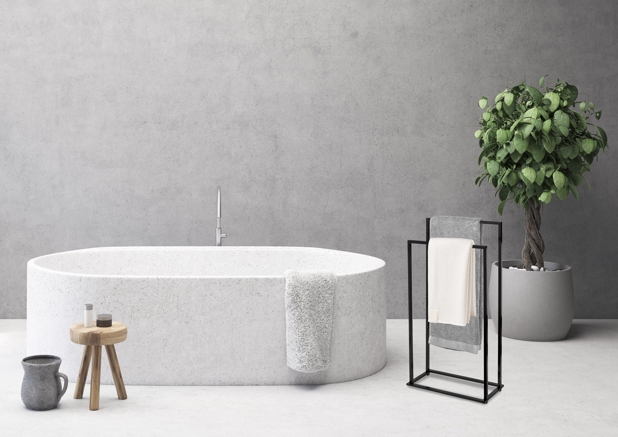 Gesi to wolnostojący praktyczny wieszak na ręczniki. Wykonany z najwyższej jakości stali malowanej proszkowo i wykończony na głęboki czarny kolor. Ma aż 2 ramiona na różnych wysokościach, co ułatwia zakładanie i ściąganie ręczników. Ramowa konstrukcja w kształcie litery U zapewnia szybsze i dokładniejsze suszenie ręczników oraz oszczędność miejsca. Stojak jest stabilny, a zarazem lekki. Bez problemu przeniesiemy go w wybrane miejsce. Podstawa stojaka zabezpieczona jest ochronnymi stopkami, które zapobiegają rysowaniu się podłogi. Jest doskonałym uzupełnieniem każdej łazienki. Oprócz walorów praktycznych stanowi ciekawą ozdobę pomieszczenia, wobec której nie można przejść obojętnie. Idealnie wkomponuje się we wnętrza w stylu loftowym czy industrialnym.