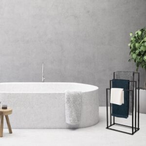 Tire to praktyczny wieszak na ręczniki wykonany z malowanej proszkowo, najwyższej jakości stali. Ma trzy ramiona na różnych wysokościach, ramową konstrukcję w kształcie litery U, ochronne stopki i czarny, matowy kolor. Stanowi doskonałe uzupełnienie każdej łazienki, pasując zarówno do stylu loftowego, jak i industrialnego.