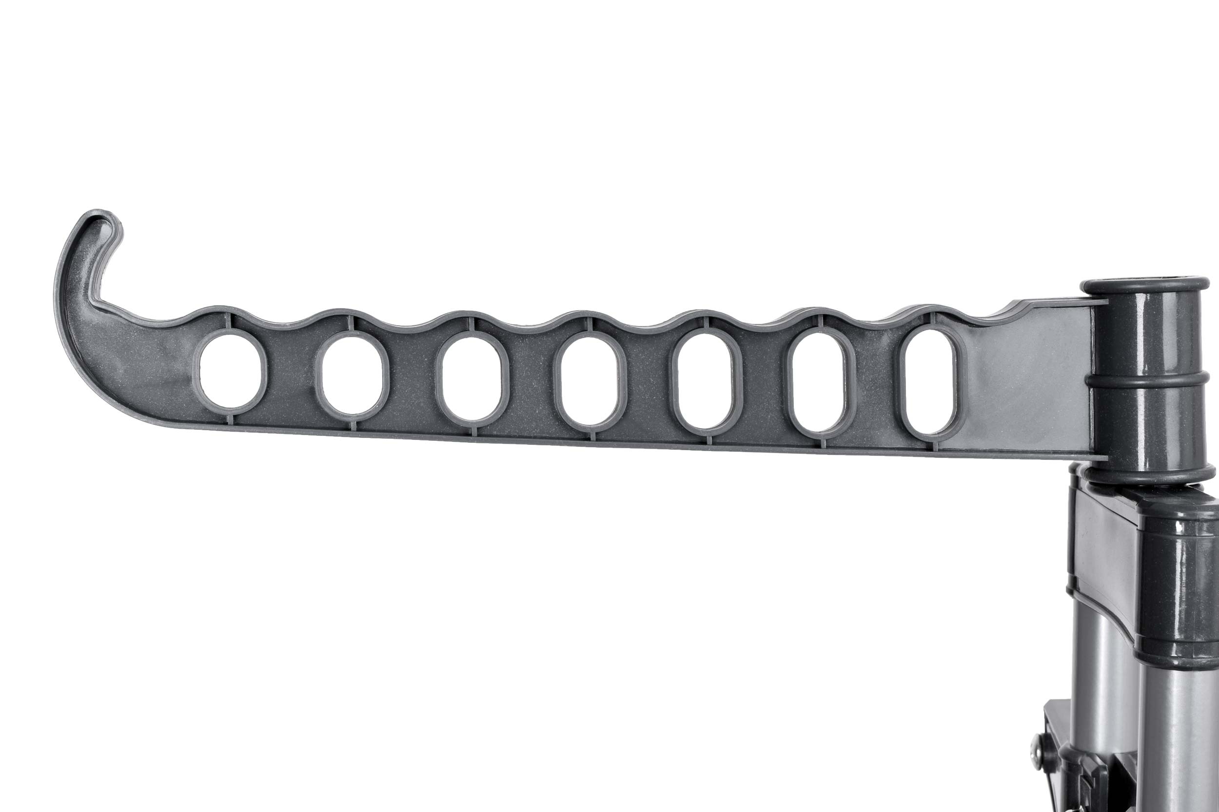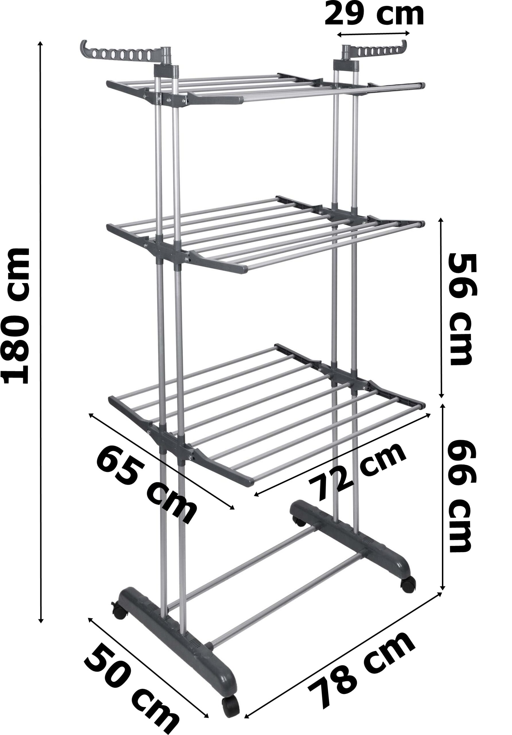 3 poziomy składanych półek + dolna półka + 2 ramiona na wieszaki