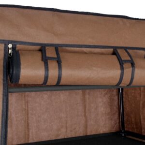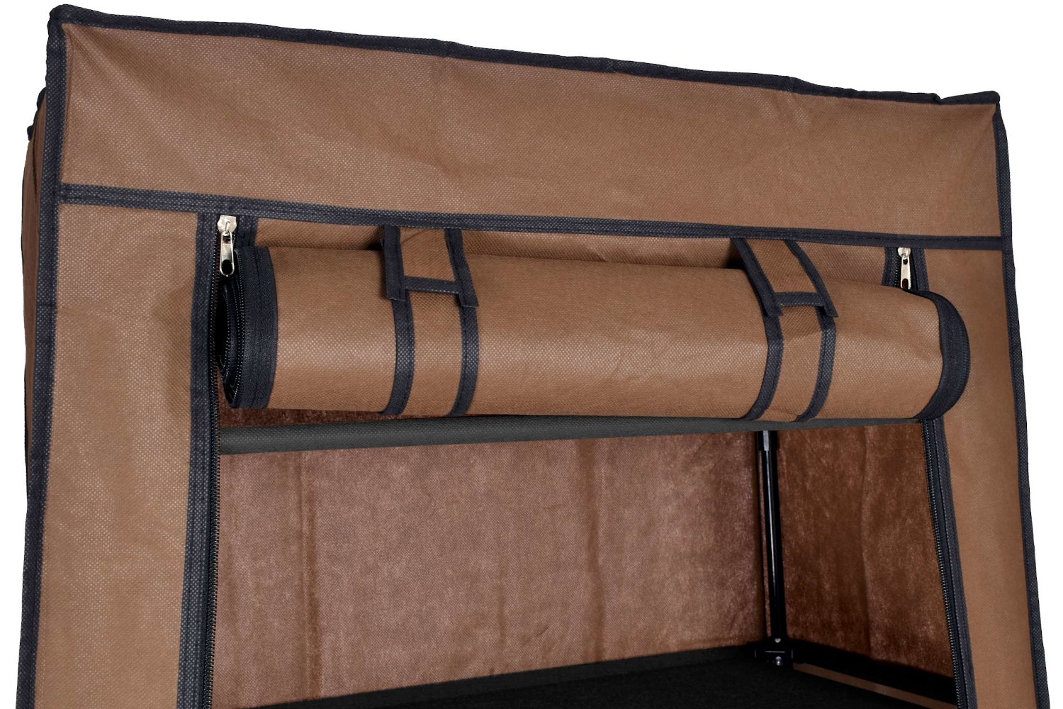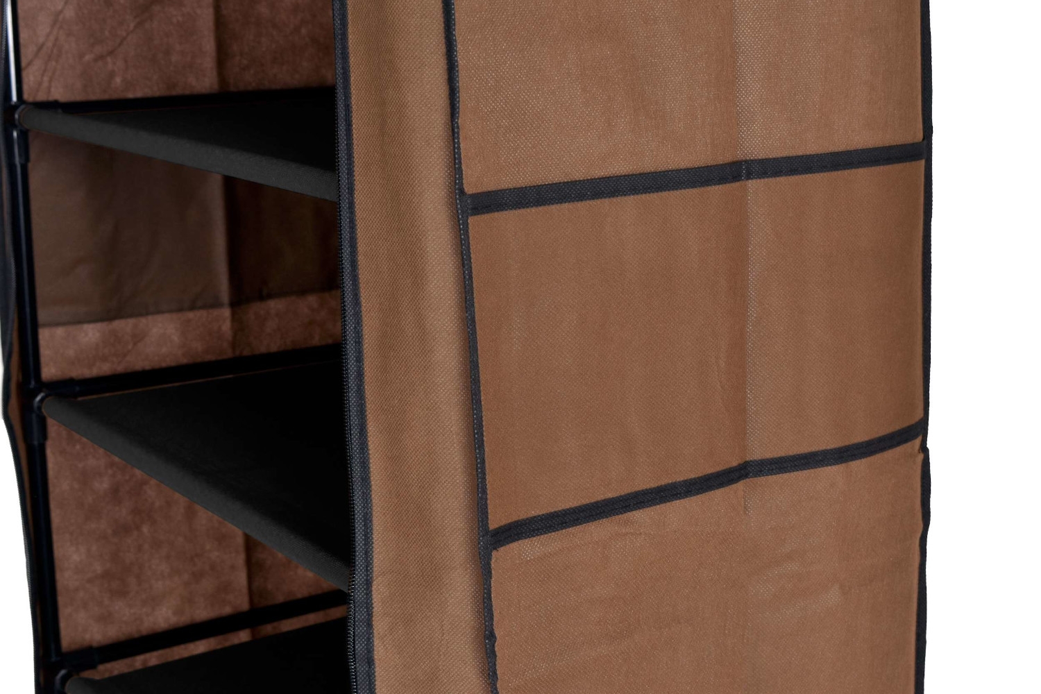 ◙ Pokrowiec garderoby nie zakrywa całości stelaża, kończy się nad dolnymi półkami.