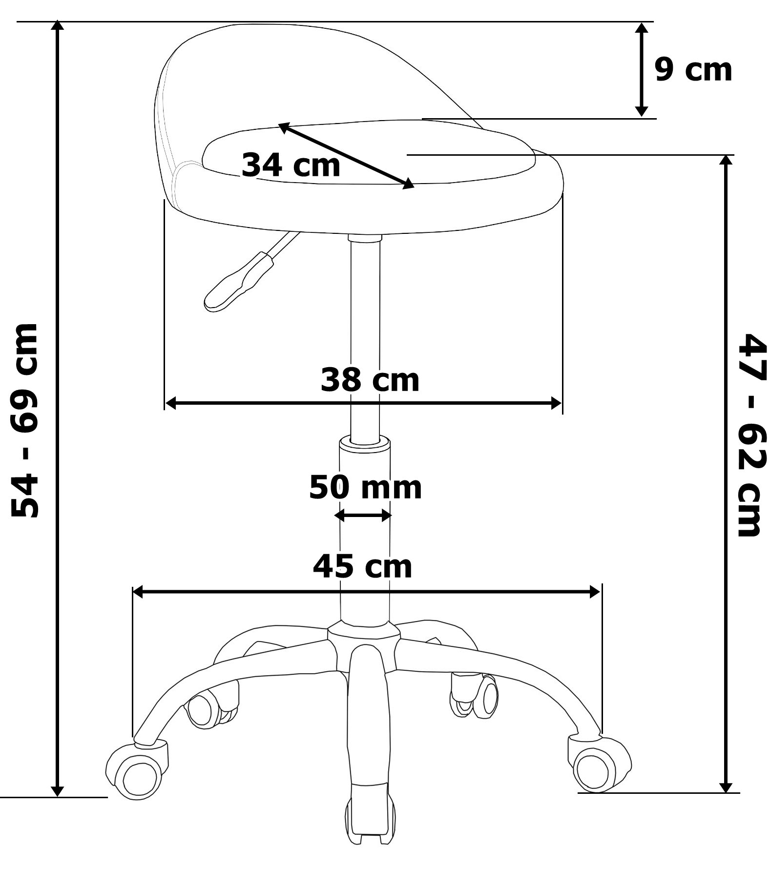 Wysokość siedziska: 47 – 62 cm