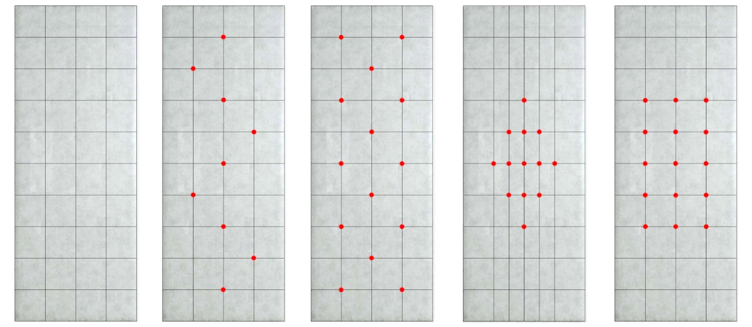 Przygotuj sobie szablon – rozciągając na tapicerce nitkę i zaplanuj rozmieszczenie guzików. W celu uzyskania efektu wgłębienia, guziki należy przybić bezpośrednio do drzwi za pomocą młotka. Warto przyłożyć do główki guzika kawałek grubego materiału lub gumy, w celu osłony jego powierzchni przed uderzeniami młotka. Poniższe schematy są tylko przykładowe, układ guzików zależy w 100% od Twojej wyobraźni.