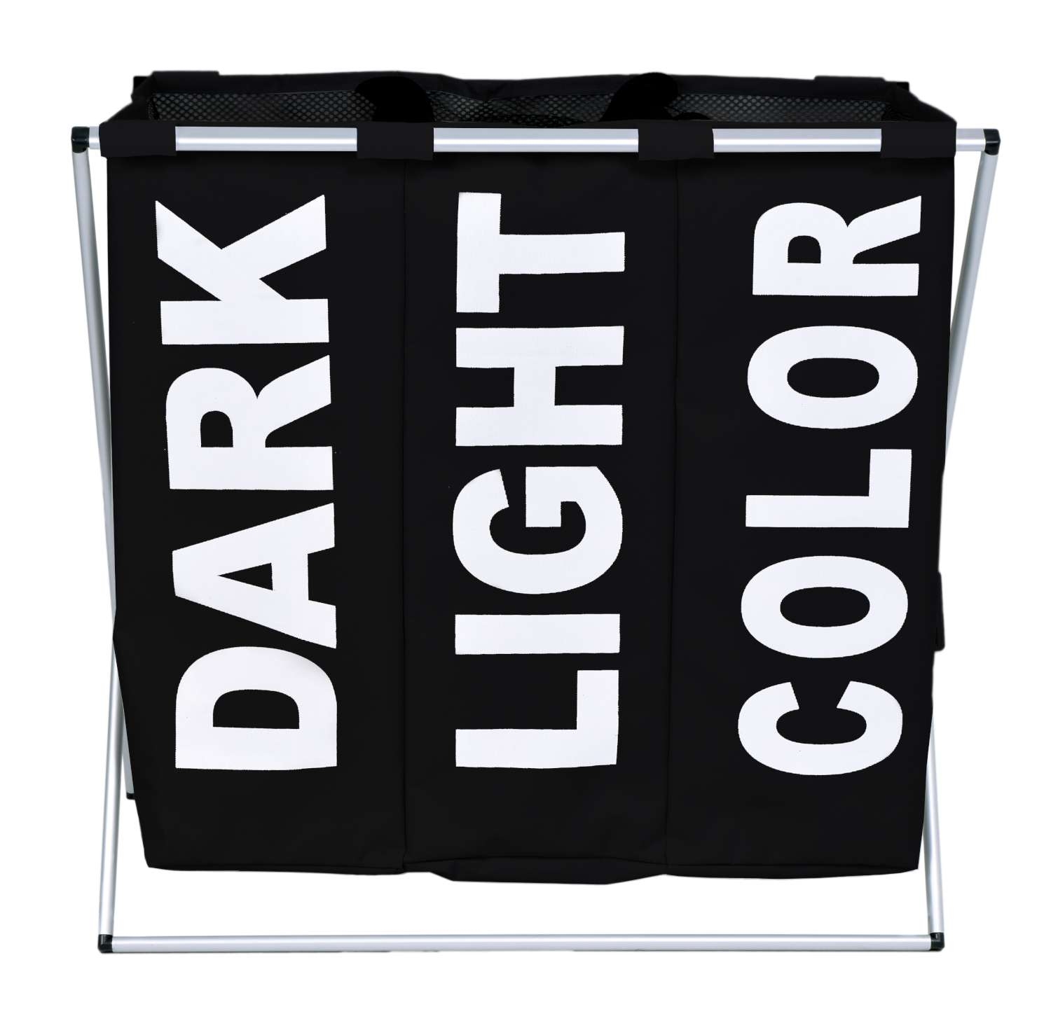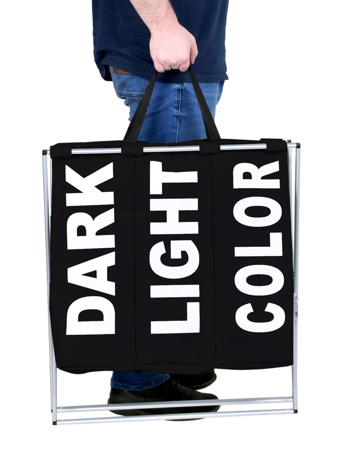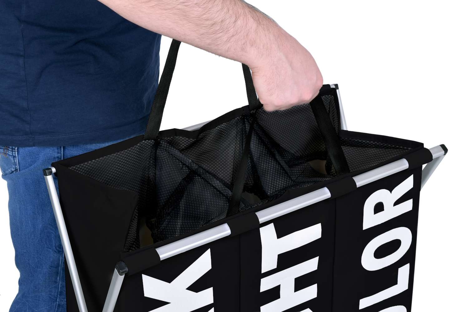 Trzykomorowy kosz na pranie TRIKO wykonany został z mocnego materiału Oxford 600D na lekkim aluminiowym stelażu. Podział na 3 komory pozwala szybko i sprawnie posegregować zabrudzoną odzież na różne rodzaje prania, dzięki temu zaoszczędzisz swój czas. Wyposażony został w wygodne rączki do przenoszenia oraz trzy ściągacze zamykające każdą komorę z osobna. Duża pojemność pozwala zmieścić wiele ubrań, co przełoży się na porządek w Twoim domu.