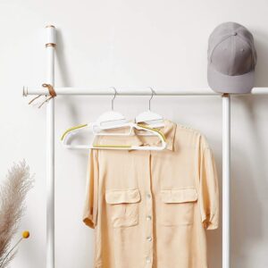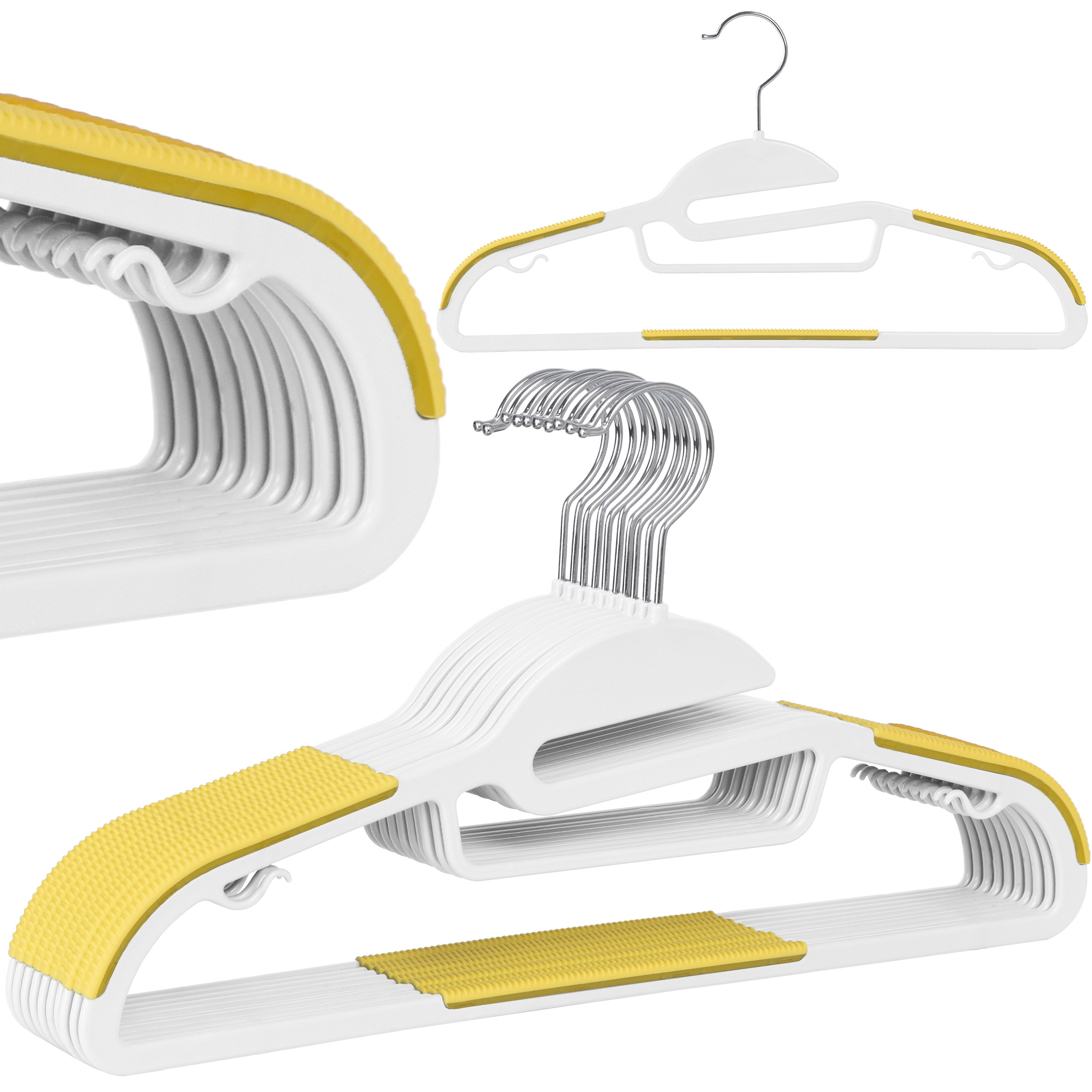 Oferujemy elastyczne i mocne wieszaki plastikowe idealne do szafy, garderoby czy też ekspozycji odzieży w butiku. Wieszaki wykonano z mocnego i wytrzymałego tworzywa sztucznego. Żółte, gumowe elementy zapobiegają zsuwaniu się ubrań, a odpowiednie wyprofilowanie sprawia, że tkaniny nie ulegają deformacji. Wieszaki posiadają metalowy, chromowany haczyk. Wieszak posiada wcięcia ułatwiające zakładanie odzieży. Dzięki temu odzież się nie rozciąga i nie deformuje.
