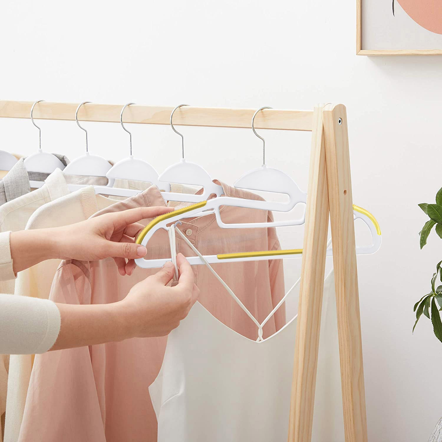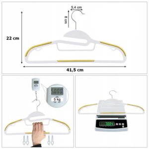 Oferujemy elastyczne i mocne wieszaki plastikowe idealne do szafy, garderoby czy też ekspozycji odzieży w butiku. Wieszaki wykonano z mocnego i wytrzymałego tworzywa sztucznego. Żółte, gumowe elementy zapobiegają zsuwaniu się ubrań, a odpowiednie wyprofilowanie sprawia, że tkaniny nie ulegają deformacji. Wieszaki posiadają metalowy, chromowany haczyk. Wieszak posiada wcięcia ułatwiające zakładanie odzieży. Dzięki temu odzież się nie rozciąga i nie deformuje.