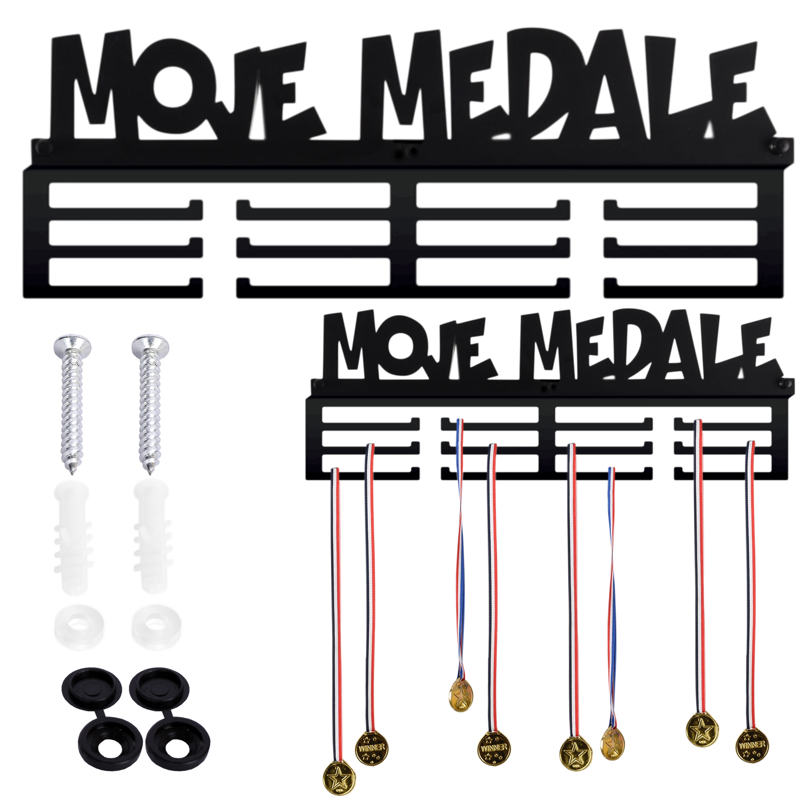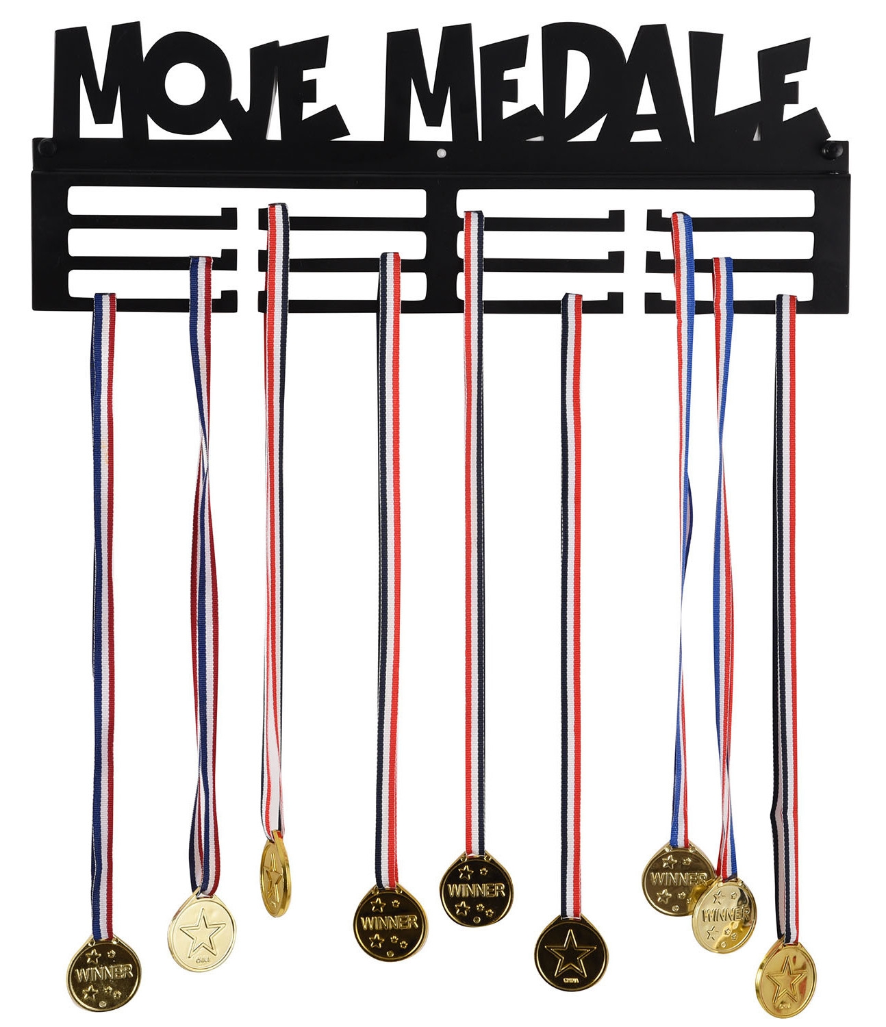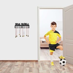 Doskonały pomysł na prezent. Wieszak na medale to najmodniejszy gadżet do pokoju zarówno dzieci jak i dorosłych! Bardzo estetycznie wykonany, literki wycinane sa bowiem laserowo. Metalową konstrukcję zabezpieczono proszkowo matowym lakierem w czarnym kolorze. Dwanaście uchwytów pomieści od sześćdziesięciu do stu medali.