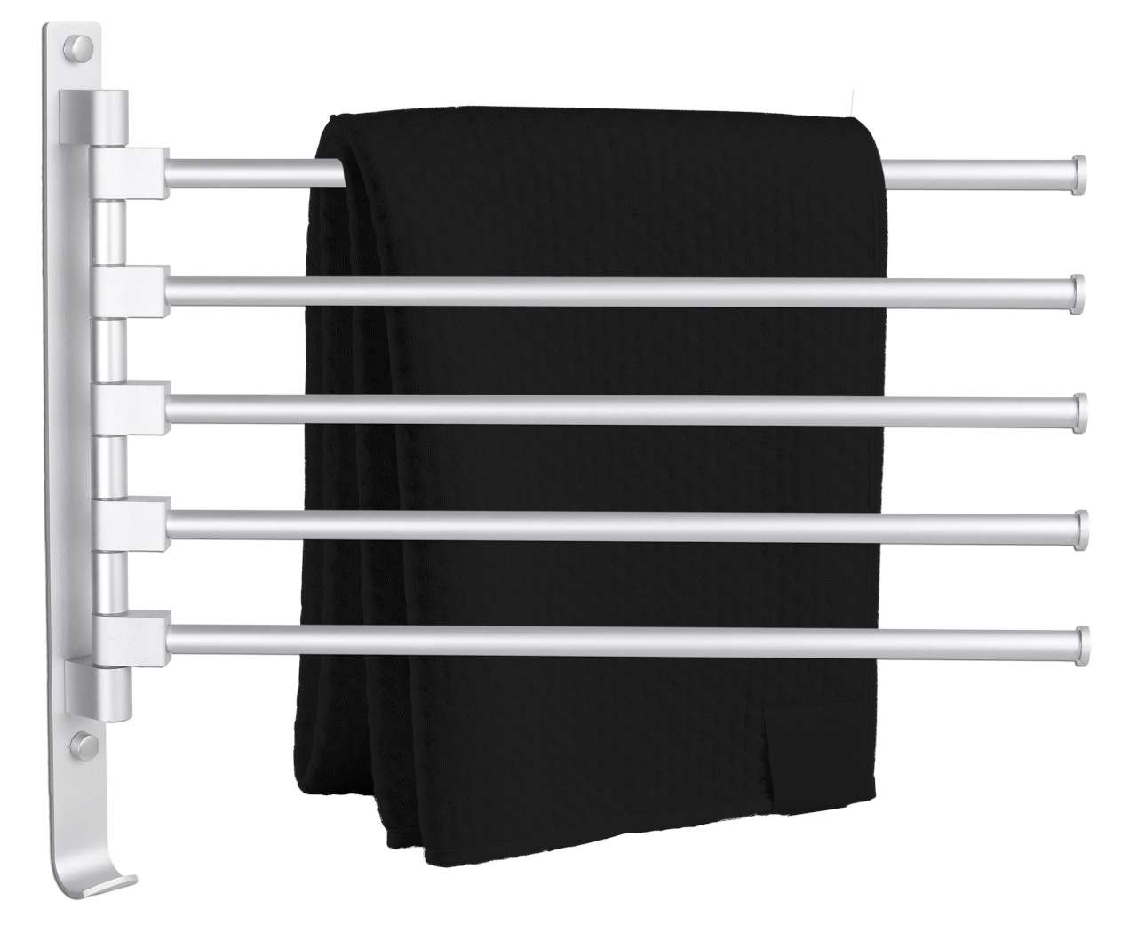 Jego główną zaletą jest fakt, że ma pięć w pełni obrotowych ramion. Można je dowolnie rozłożyć lub złożyć razem przy ścianie. Ma też dodatkowy hak na ubrania czy szlafrok.