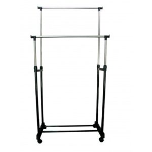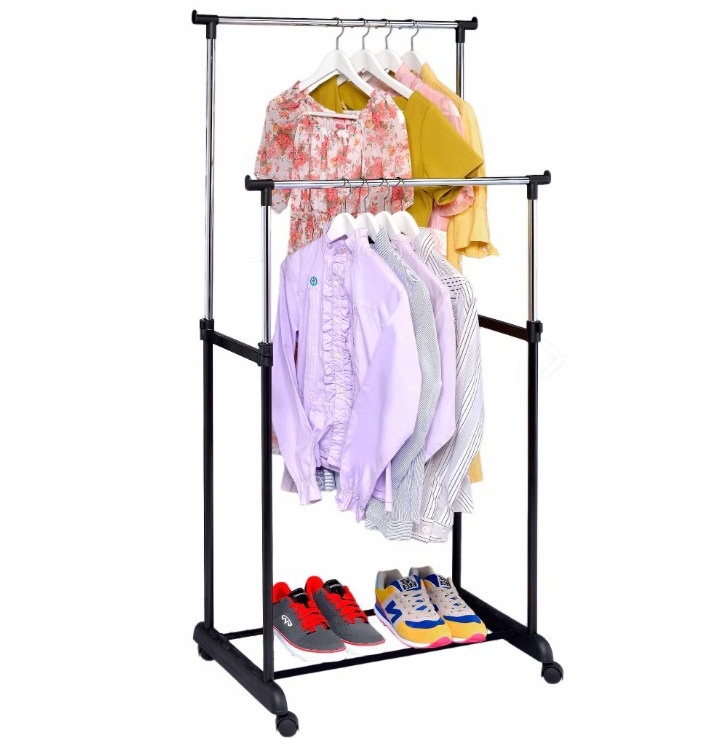 Praktyczny i wytrzymały wieszak garderobiany na kółkach. Wieszak sprawdzi się w każdym domu i w biurze, w którym brakuje miejsca do powieszenia odzieży. Nasz produkt został wyposażony w podwójny chromowany drążek, którego wysokość można łatwo regulować za pomocą nakrętek oraz kółka umożliwiające wygodne przemieszczanie. Dodatkowym atutem wieszaka są nakładki na końce drążka uniemożliwiające zsunięcie się odzieży. Montaż wieszaka jest niezwykle prosty i nie wymaga użycia narzędzi.