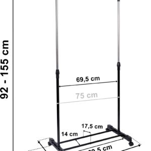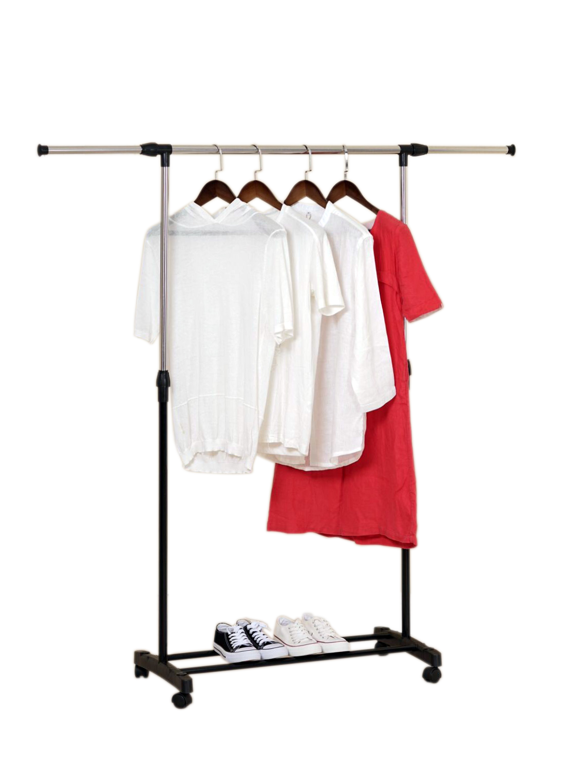 Praktyczny i wytrzymały wieszak garderobiany na kółkach. Wieszak sprawdzi się w każdym domu i w biurze, w którym brakuje miejsca do powieszenia odzieży. Nasz produkt został wyposażony w pojedynczy chromowany drążek, który pomieści dużo odzieży. Dodatkowym atutem wieszaka jest wytrzymała i zaskakująco pojemna półka na buty, oraz nakładki na końce drążka uniemożliwiające zsunięcie się odzieży. Montaż wieszaka jest niezwykle prosty i nie wymaga użycia narzędzi.