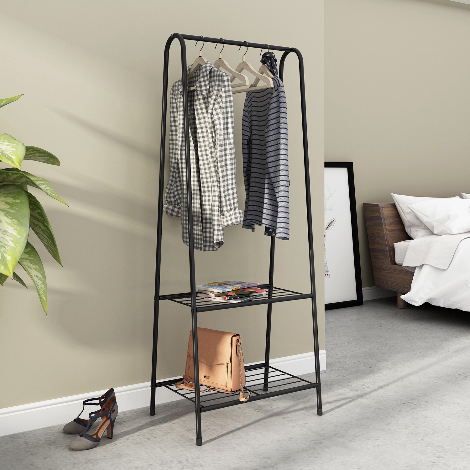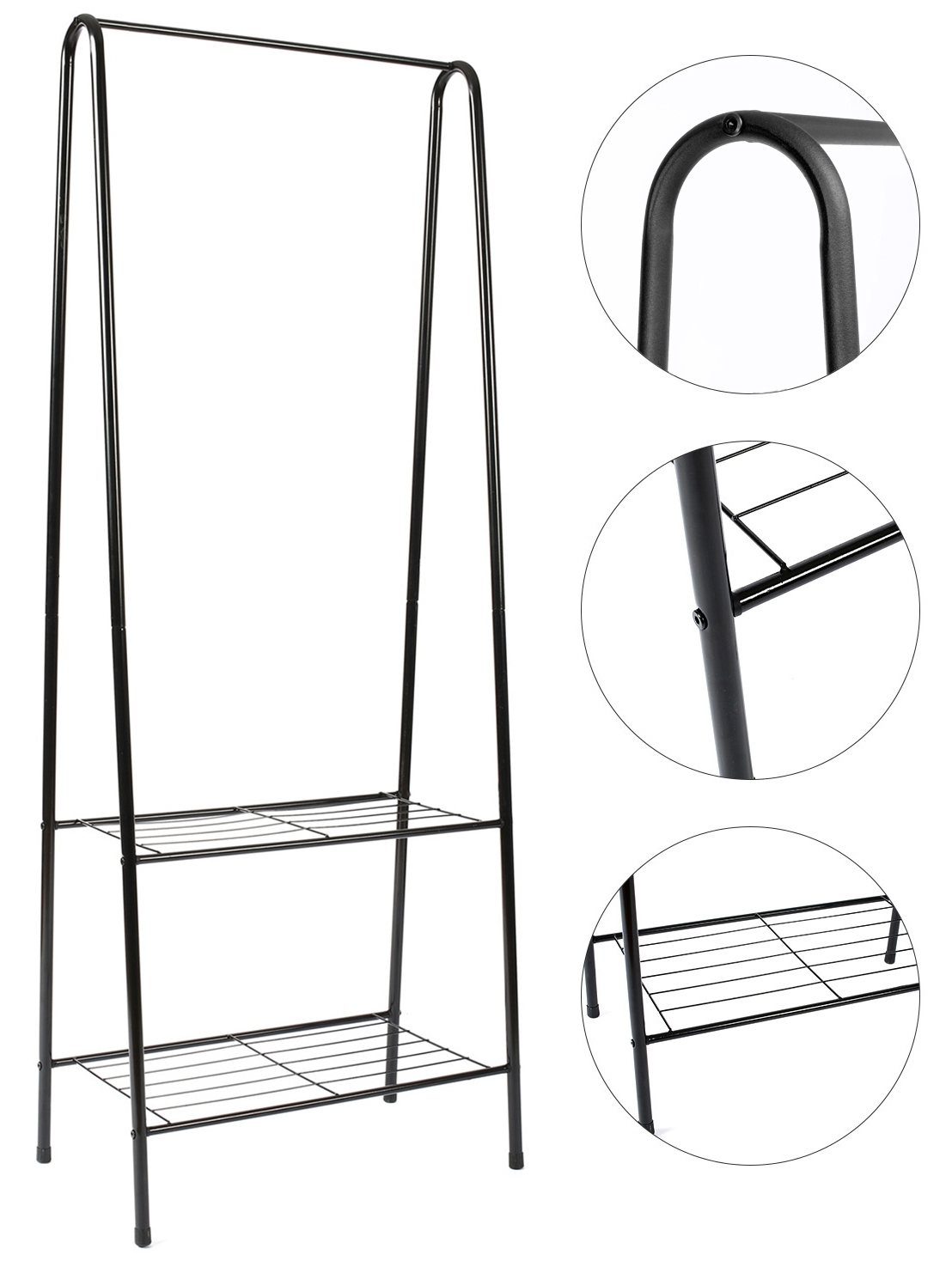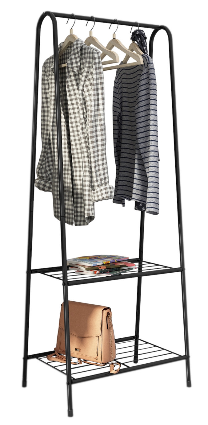 Jego przeznaczenie zależy od Ciebie. Wieszak wyposażony w górny drążek oraz dwie półki w dolnej części.