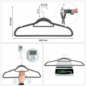 Komplet wieszaków aksamitnych. Flokowana powierzchnia czyni je bardzo praktycznymi, zapobiega bowiem zsuwaniu się ubrań. Wieszaki Maxi są odpowiednio profilowane, co pomaga uniknąć zagnieceń na odzieży.