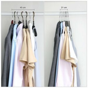 Komplet wieszaków aksamitnych. Flokowana powierzchnia czyni je bardzo praktycznymi, zapobiega bowiem zsuwaniu się ubrań. Wieszaki Maxi są odpowiednio profilowane, co pomaga uniknąć zagnieceń na odzieży.