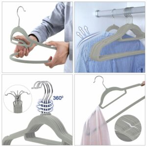 Wieszaki welurowe są bardzo wytrzymałe a przy tym cienkie. Ciężko je złamać. Mają wyprofilowany kształt, dzięki czemu ubrania się nie odkształcają. Pokrycie welurem gwarantuje niezsuwanie się ubrań i niepowstawanie zagnieceń. W pełni obrotowe chromowane haczyki zwiększają komfort użytkowania.