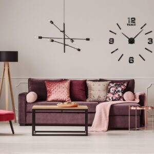 Nowoczesny zegar typu DIY – zrób to sam. Idealny dodatek do każdego salonu lub biura. Wielkość zegara zależy od Ciebie! Możesz mu nadać dowolną średnicę! Sugerujemy rozmiar 80-100 cm, wówczas zegar prezentuje się najlepiej. Zegar do przyklejenia na ścianie lub do innych gładkich powierzchni.