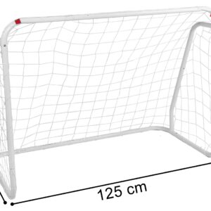 Specyfikacja: Stal malowana proszkowo jest materiałem stelaża, waga bramki wynosi 4 kg, w zestawie znajdują się 2 bramki, 8 szpilek, kolor biały. Zestaw zawiera metalowe profile, instrukcję w języku polskim, siatkę piłkarską, szpilki mocujące do podłoża, zestaw montażowy. Produkt jest zgodny z normą EN-71.