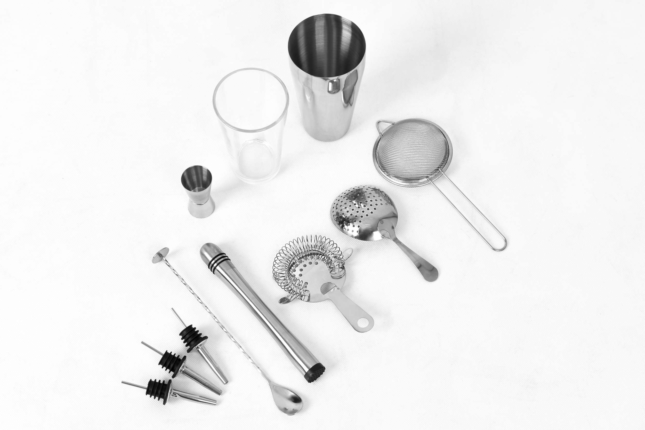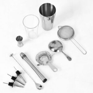 Wysokiej jakości zestaw barmański ze stali nierdzewnej. W jego skład wchodzi wszystko, co niezbędne- shaker bostoński, miarkę, filtry, nalewak i inne. Szczegółowa lista poniżej. Całość wykonana ze stali szlachetnej, dzięki czemu napoje zachowują swój unikatowy smak. Zestaw można wygodnie myć w zmywarce. Polecamy na prezent.