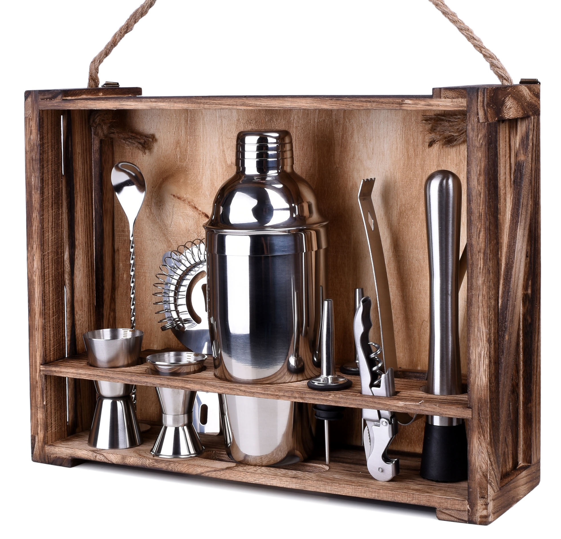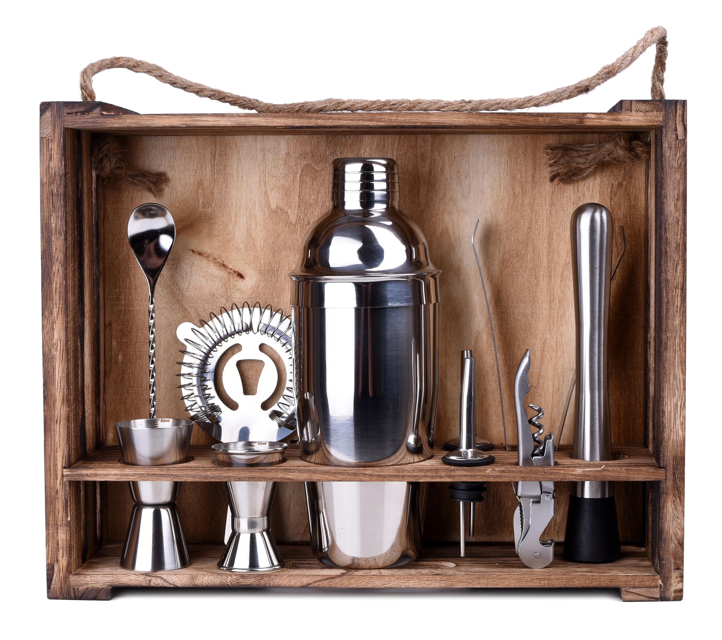 Robisz imprezę i chcesz zaskoczyć swoich gości? Zestaw barmański pomoże Ci rozkręcić imprezę i przygotować oryginalne, ciekawe drinki. Każdy element kompletu wykonany został z najwyższej jakości stali szlachetnej, dzięki czemu nie zmienia smaku napojów. W zestawie aż 11 elementów: 10 akcesoriów ze stali nierdzewnej oraz stojak z drewna sosnowego poddany procesowi karbonizacji.