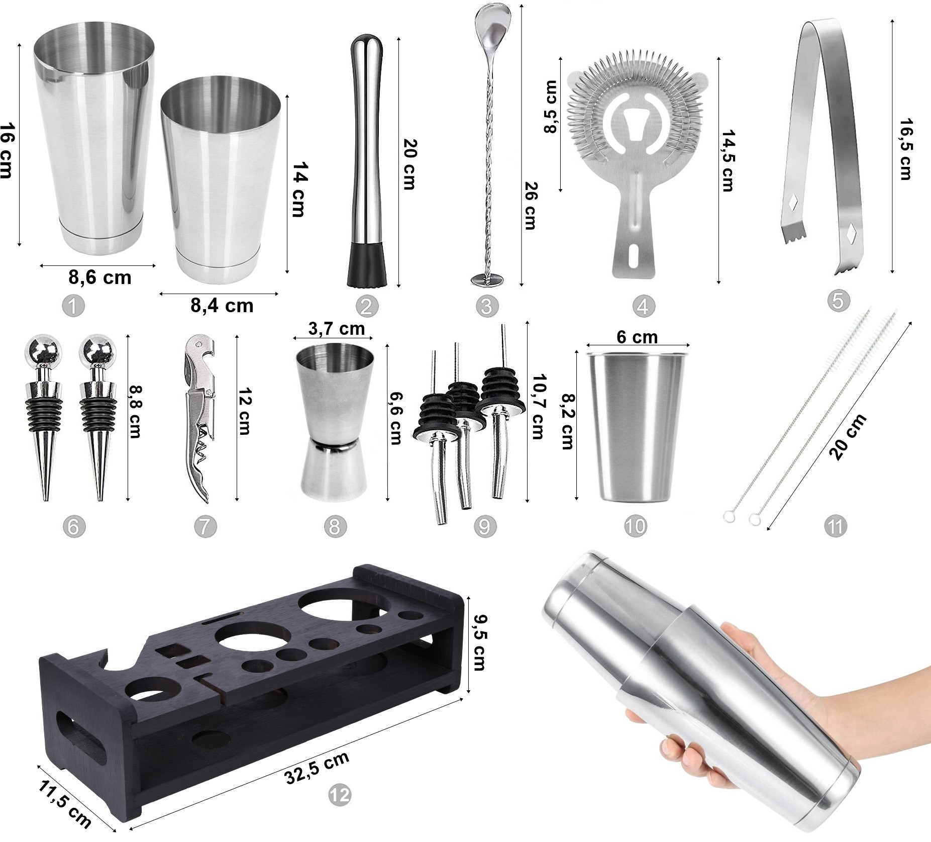 Zestaw barmański PRESTON chromowany 17 elementów