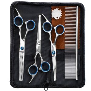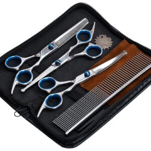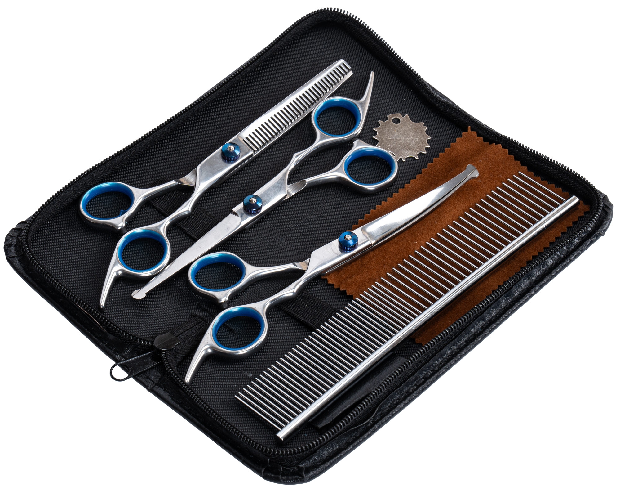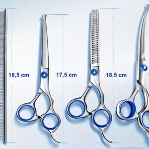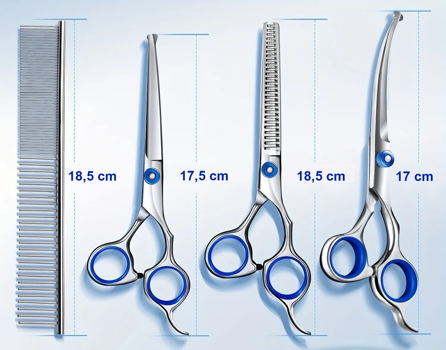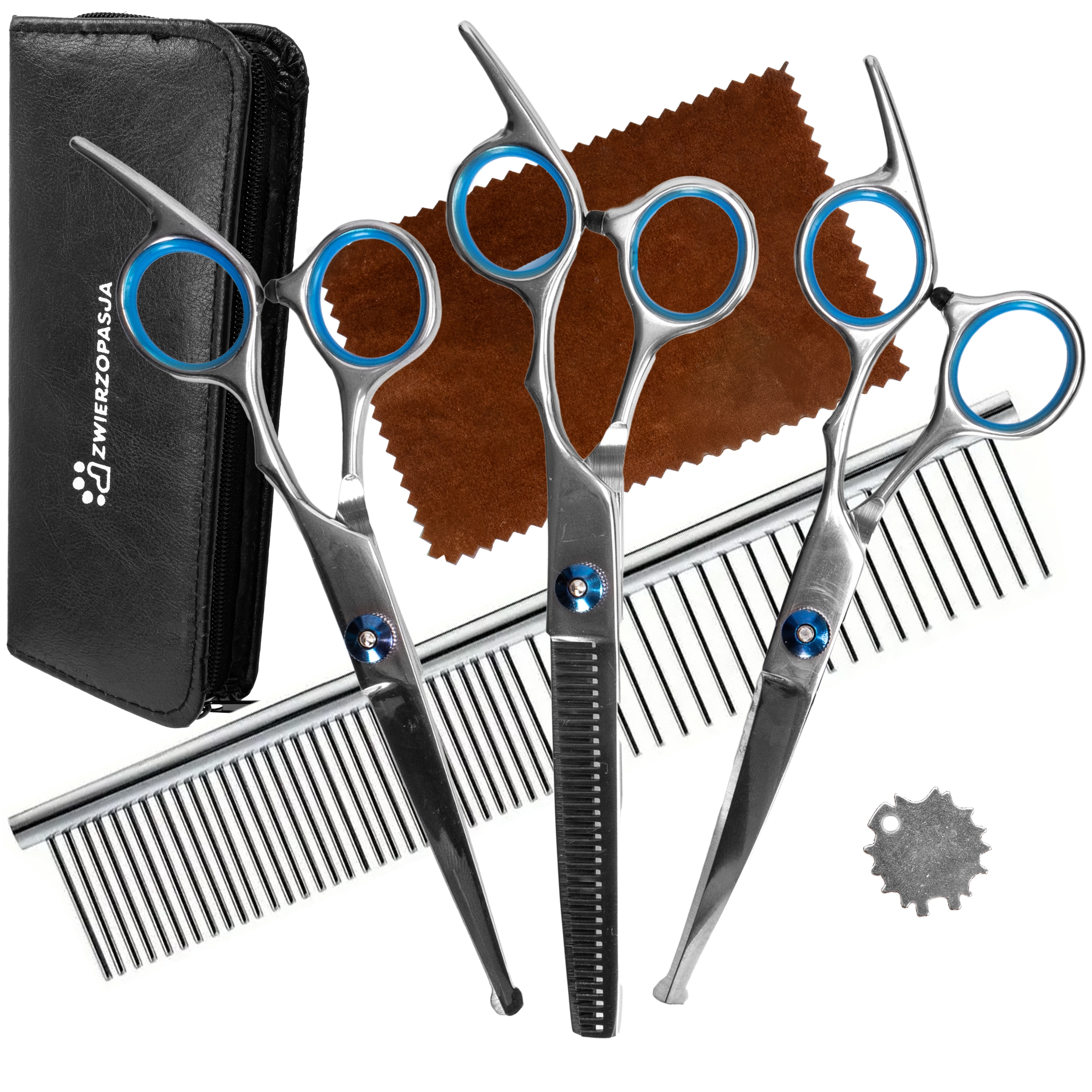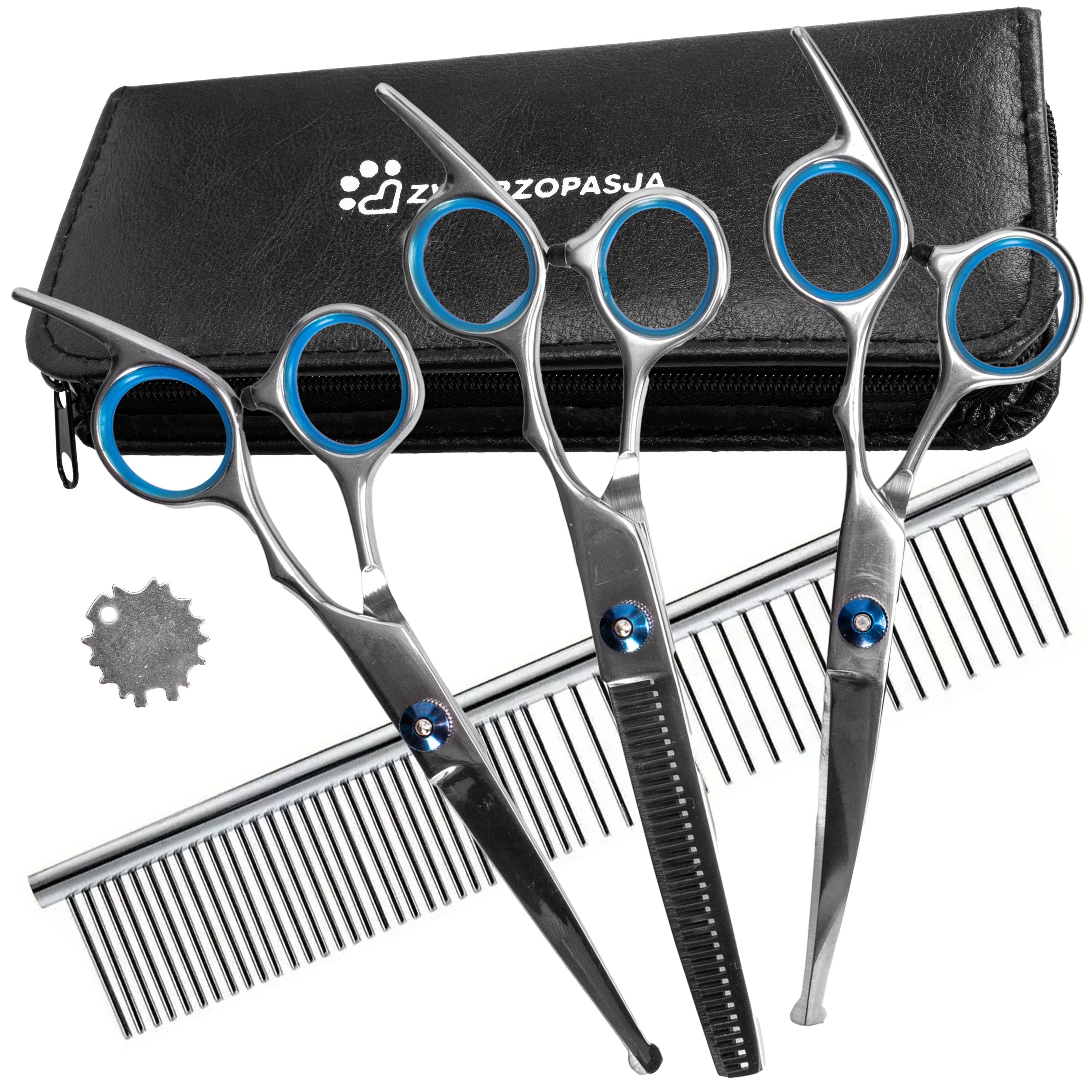 Duży zestaw narzędzi: Zestaw zawiera różne rodzaje nożyczek, w tym proste, degażówki oraz zakrzywione, co umożliwia dostosowanie narzędzi do każdego zadania pielęgnacyjnego. Dzięki temu możesz kompleksowo zadbać o sierść swojego pupila, niezależnie od jego potrzeb.