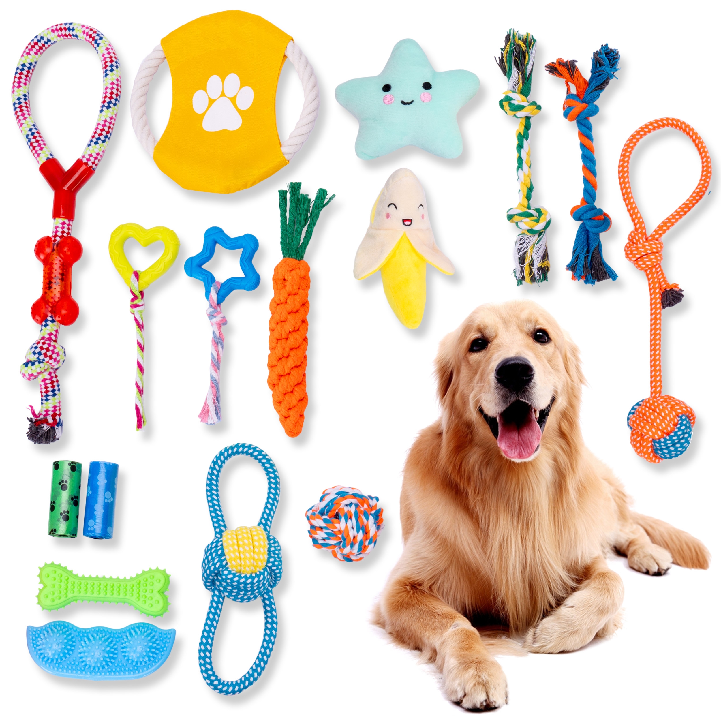 Zapewnij swojemu psu różnorodność i niekończącą się zabawę dzięki naszemu bogatemu zestawowi szarpaków. Ten wyjątkowy zestaw składa się aż z 14 różnych zabawek, które dostarczą Twojemu pupilowi niezapomnianych chwil radości i rozrywki. Dzięki różnorodności szarpaków, Twój pies będzie miał wiele opcji do wyboru i możliwość eksplorowania różnych form zabawy. Niezależnie od preferencji Twojego psa, nasz zestaw zapewnia mnóstwo atrakcji, które utrzymają jego zainteresowanie i spełnią jego potrzeby.W zestawie znajdziesz nie tylko szarpaki, ale także gryzaki i kolorowe maskotki z piszczałkami, dla jeszcze większej frajdy z zabawy!