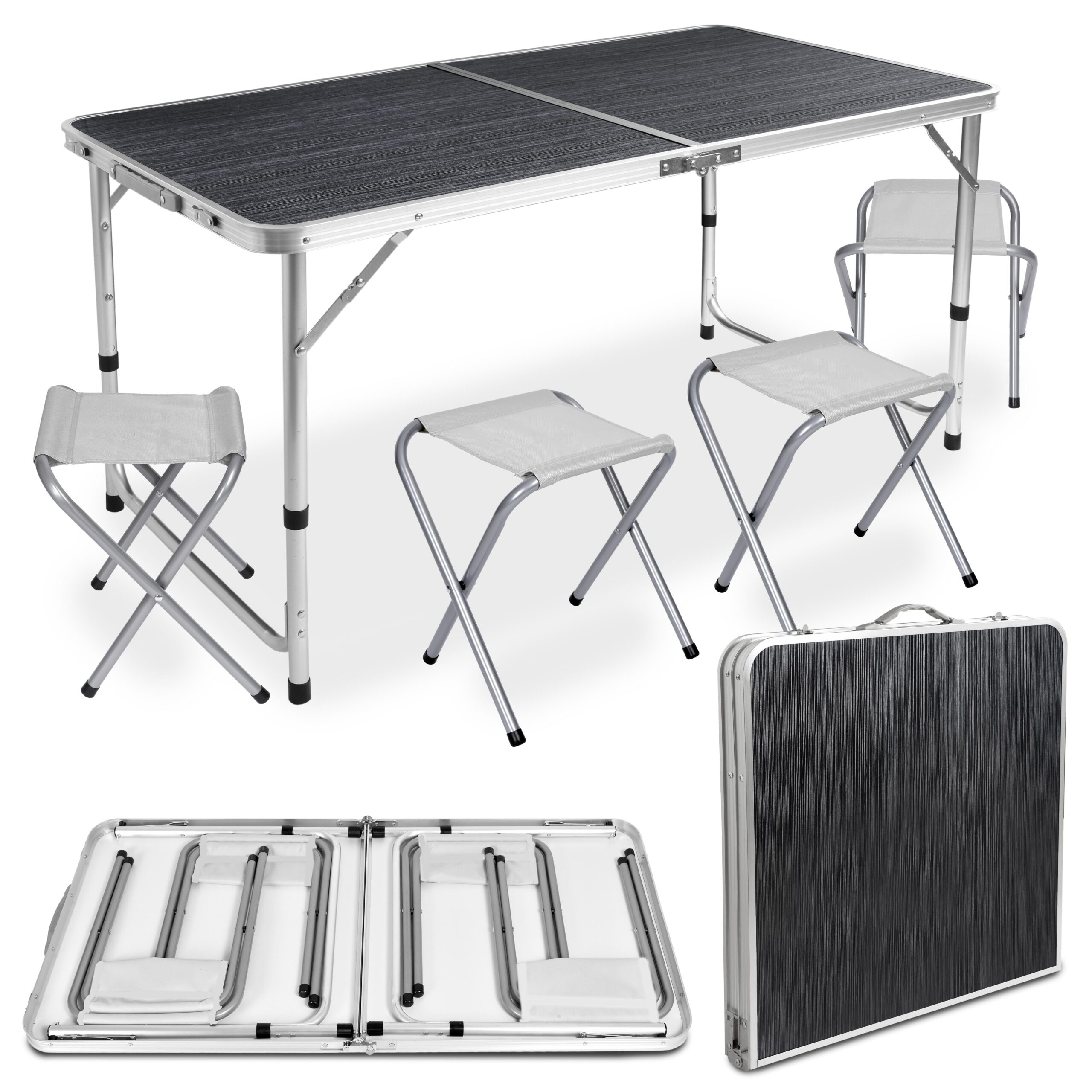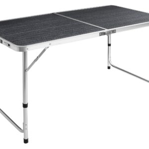 Turystyczny zestaw kempingowy TRIP składa się ze stołu i czterech krzeseł. Komplet wygodnie się rozkłada i składa do postaci walizki. W transporcie pomaga wygodna rączka. Stolik posiada regulowaną wysokość, blat można ustawić na trzech wysokościach. Stelaż TRIP wykonano z wysokiej jakości aluminium, dzięki czemu jest bardzo lekki. Blat powstał z trwałej płyty MDF. Takie połączenie materiałów zapewnia niską wagę, dzięki czemu transportowanie zestawu jest bezproblemowe. Rozkładanie stolika i krzesełek jest bardzo proste. Stolik wyposażony został w rączkę, która umożliwia wygodne przenoszenie.