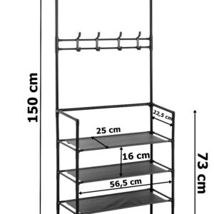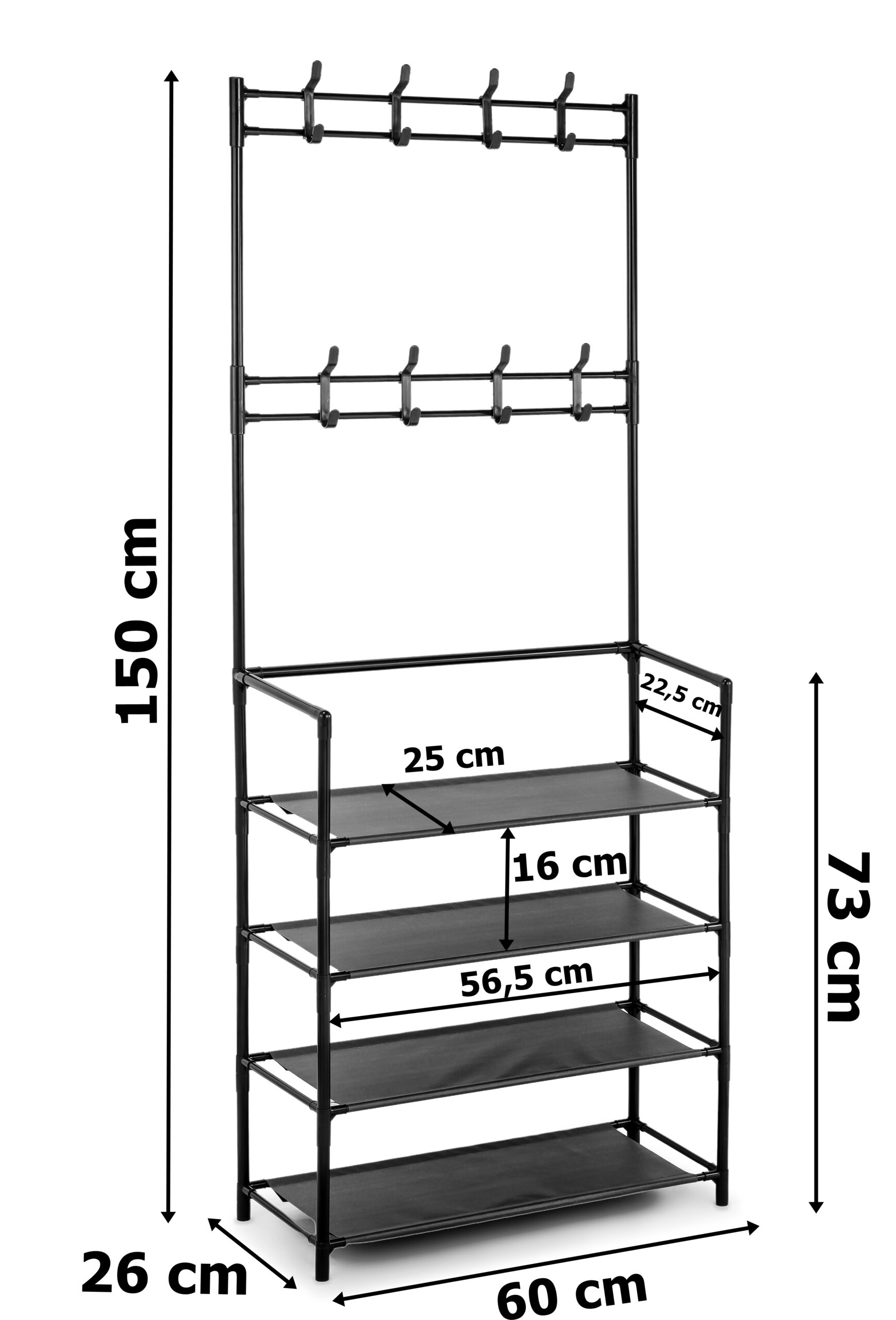 Hani to wieszak stojący o bogatym zastosowaniu. Wykonany z materiałów wysokiej jakości z zachowaniem dbałości o najmniejsze detale. Metalowa konstrukcja ze stali malowanej proszkowo wykończona jest na głęboki, czarny połysk. Hani posiada osiem haczyków do zawieszania kurtek oraz aż 4 półki na buty i akcesoria. Haczyki nie są integralną częścią wieszaka, są wciskane i ruchome na boki, dzięki czemu można je układać wg własnego uznania. Materiał półek na buty jest wodoodporny i łatwy do utrzymania w czystości. Model świetnie sprawdzi się w nowocześnie zaaranżowanych pomieszczeniach. Idealnie pasuje do stylu loftowego, skandynawskiego i klasycznego.
